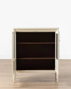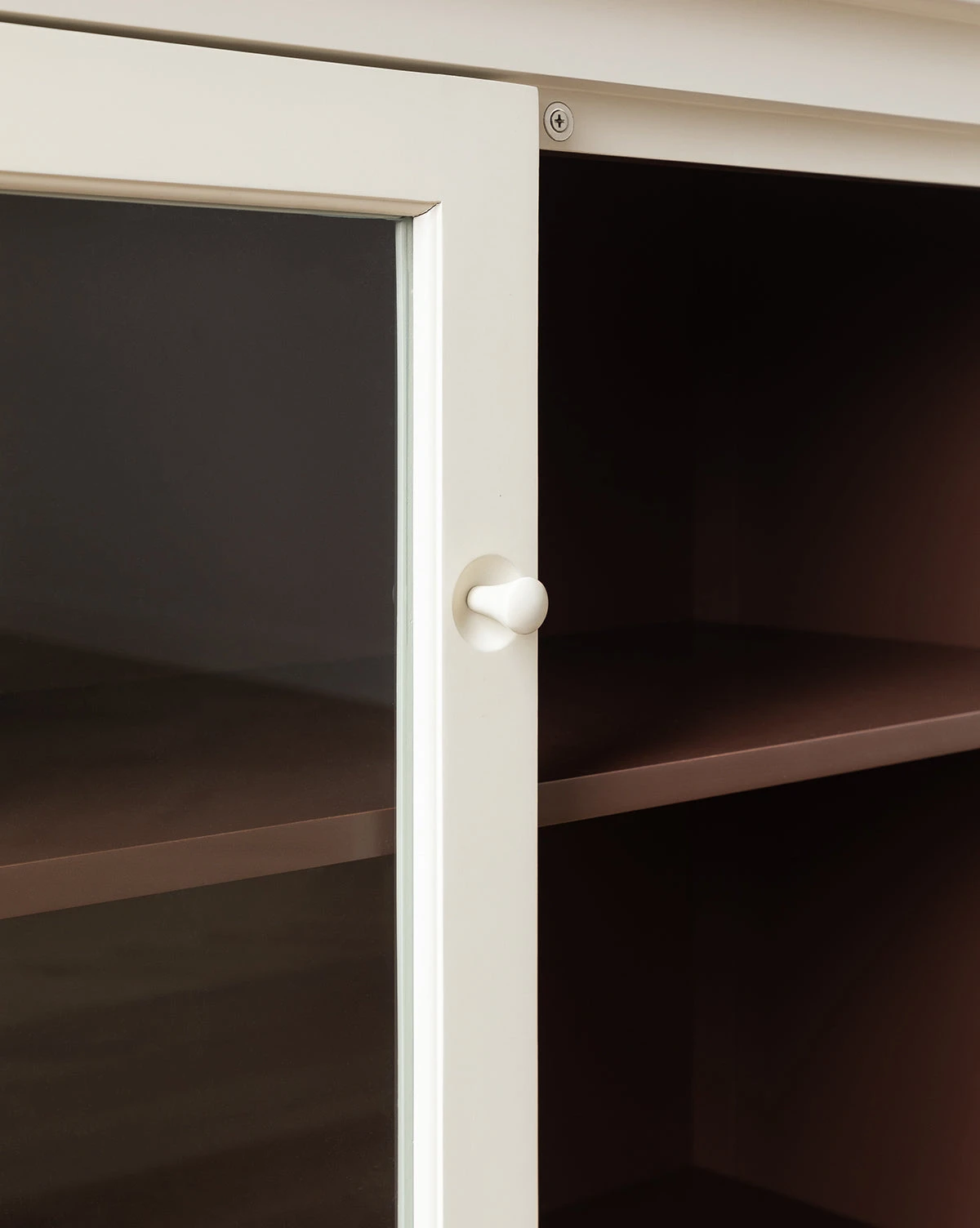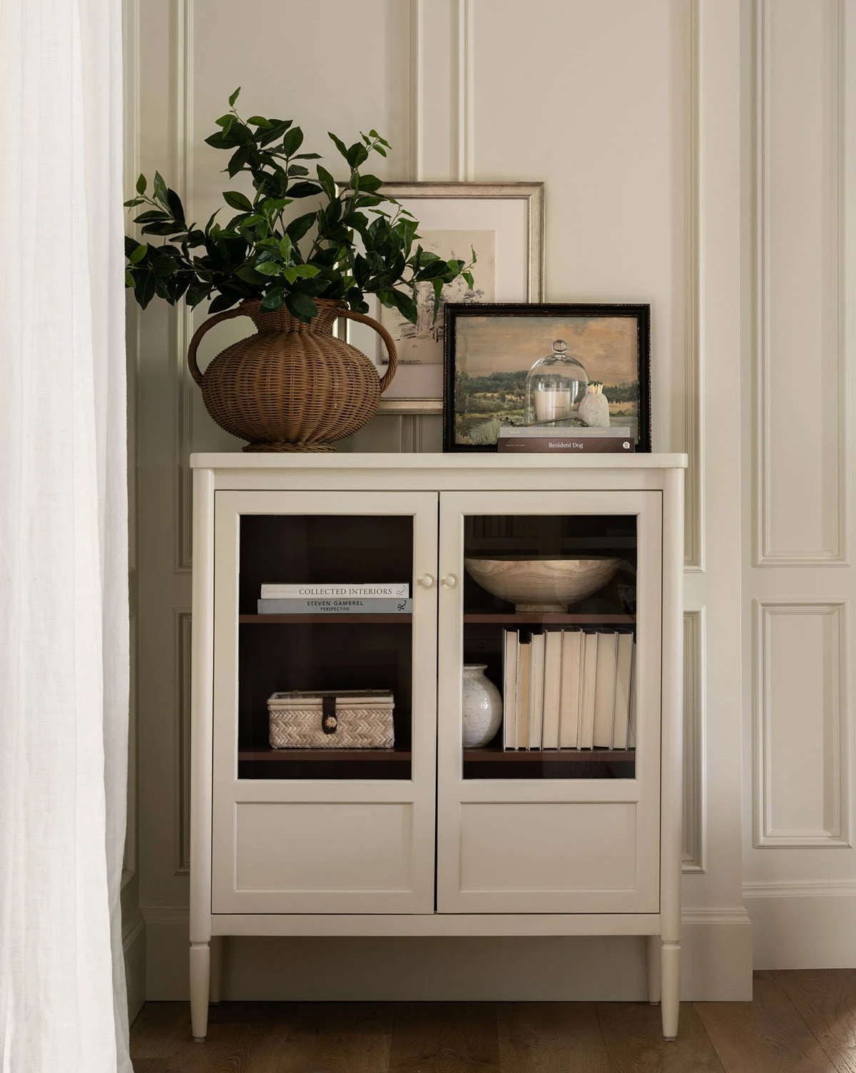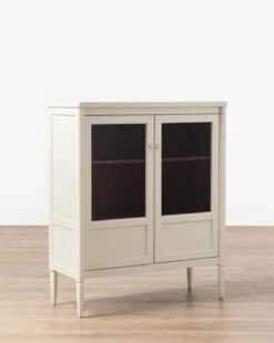 Elevate your dining or living room with the classic form of the Highgate Cabinet. Inspired by Victorian furniture in shape and style, the cabinet is finished in bone white in contrast to the rich brown interior. Glass doors open to spacious shelves for a practical function while inset details and tapered legs bring the elegant nuances of its Victorian furniture inspiration to your decor.