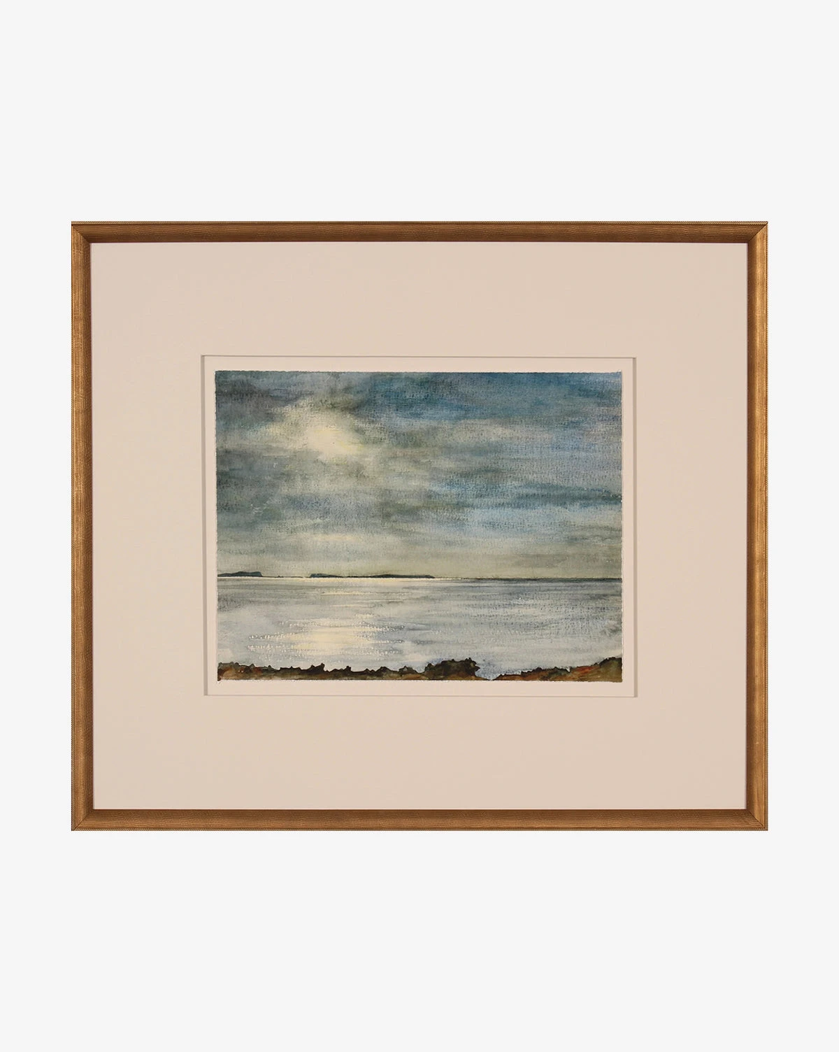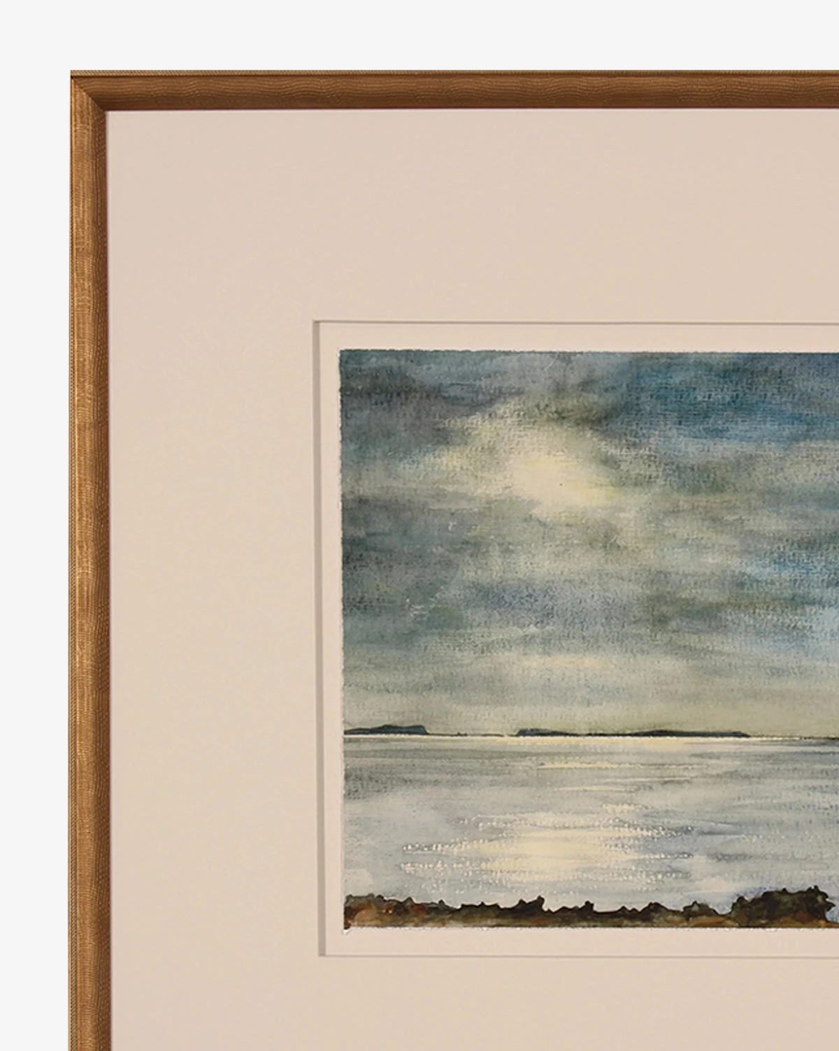 A calming coastal scene with a moody sky and beautiful contrast comes to life with each detail in Illumination. A museum-quality giclee print on textured watercolor paper, the expressive artwork tells a story wherever the piece rests. The gold-embossed wood frame adds character to your wall treatments or dresser vignettes. Â
