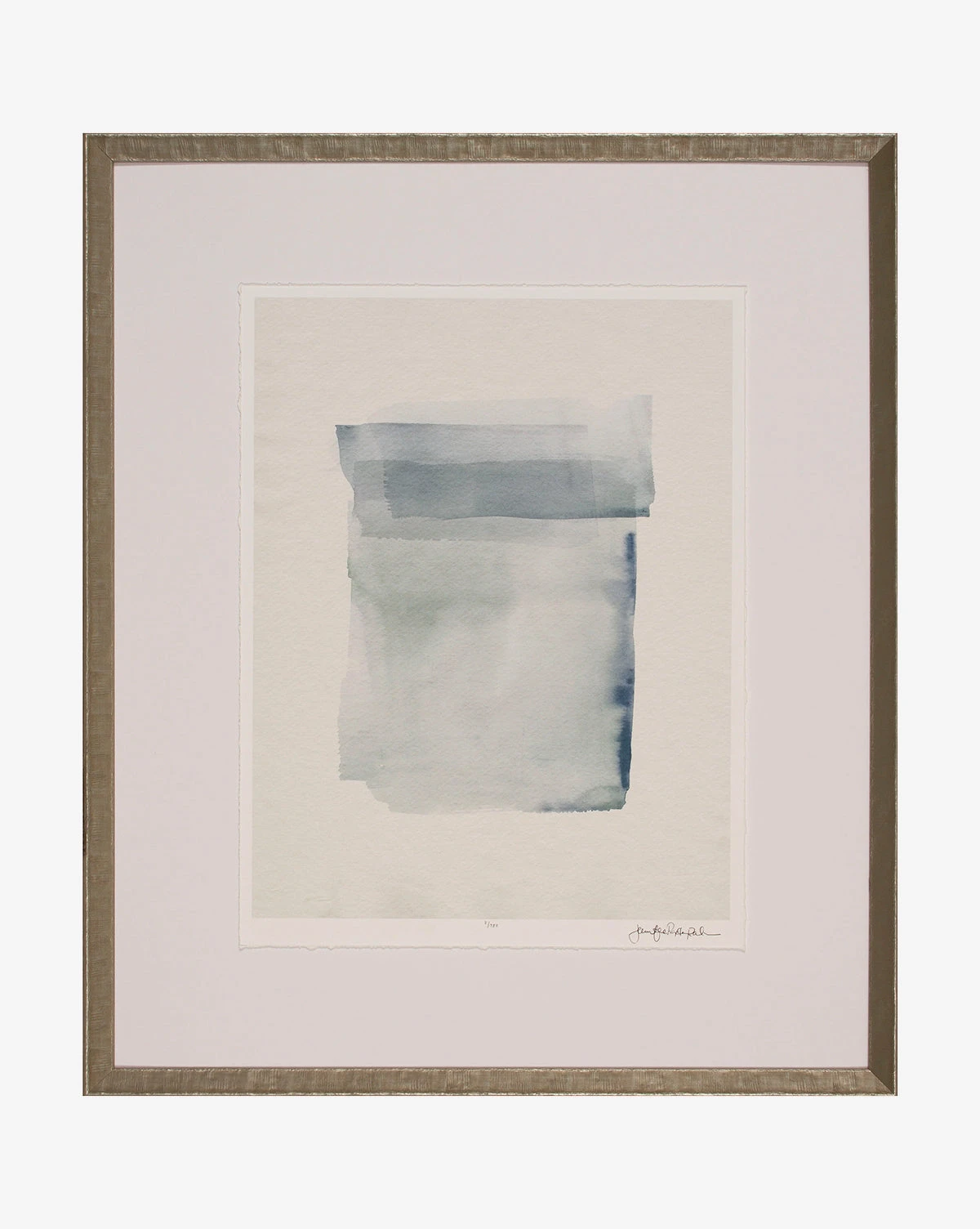 Abstract and serene, Jade Abstract beautifully plays with tones of blue. The watercolor print on textured fine art paper draws attention to the intentional brush strokes within its minimalistic composition, adding depth to your decor whether styled alone or as a collection.