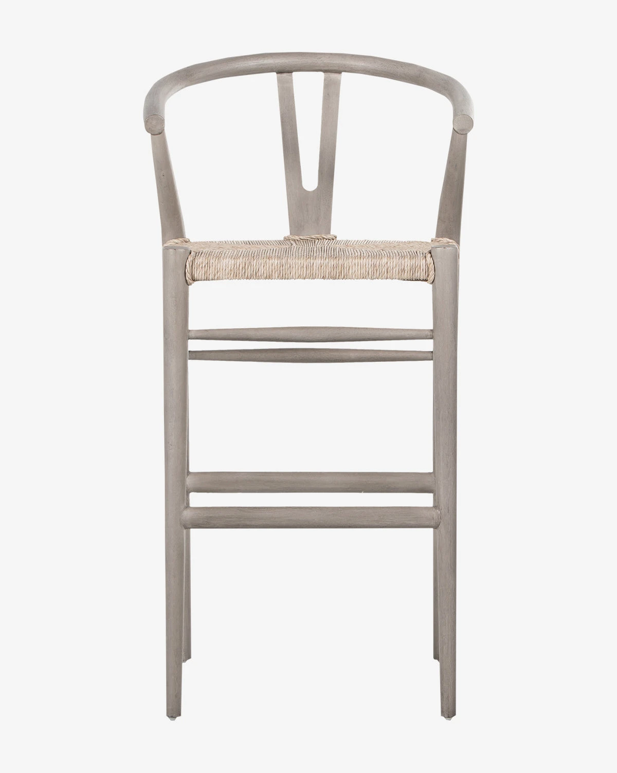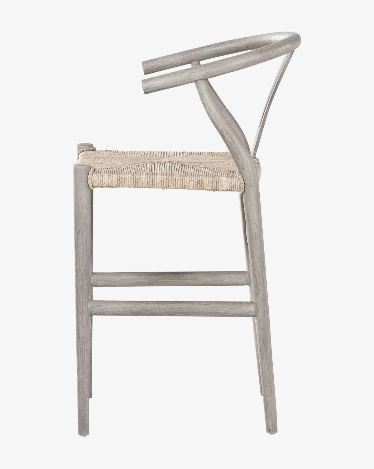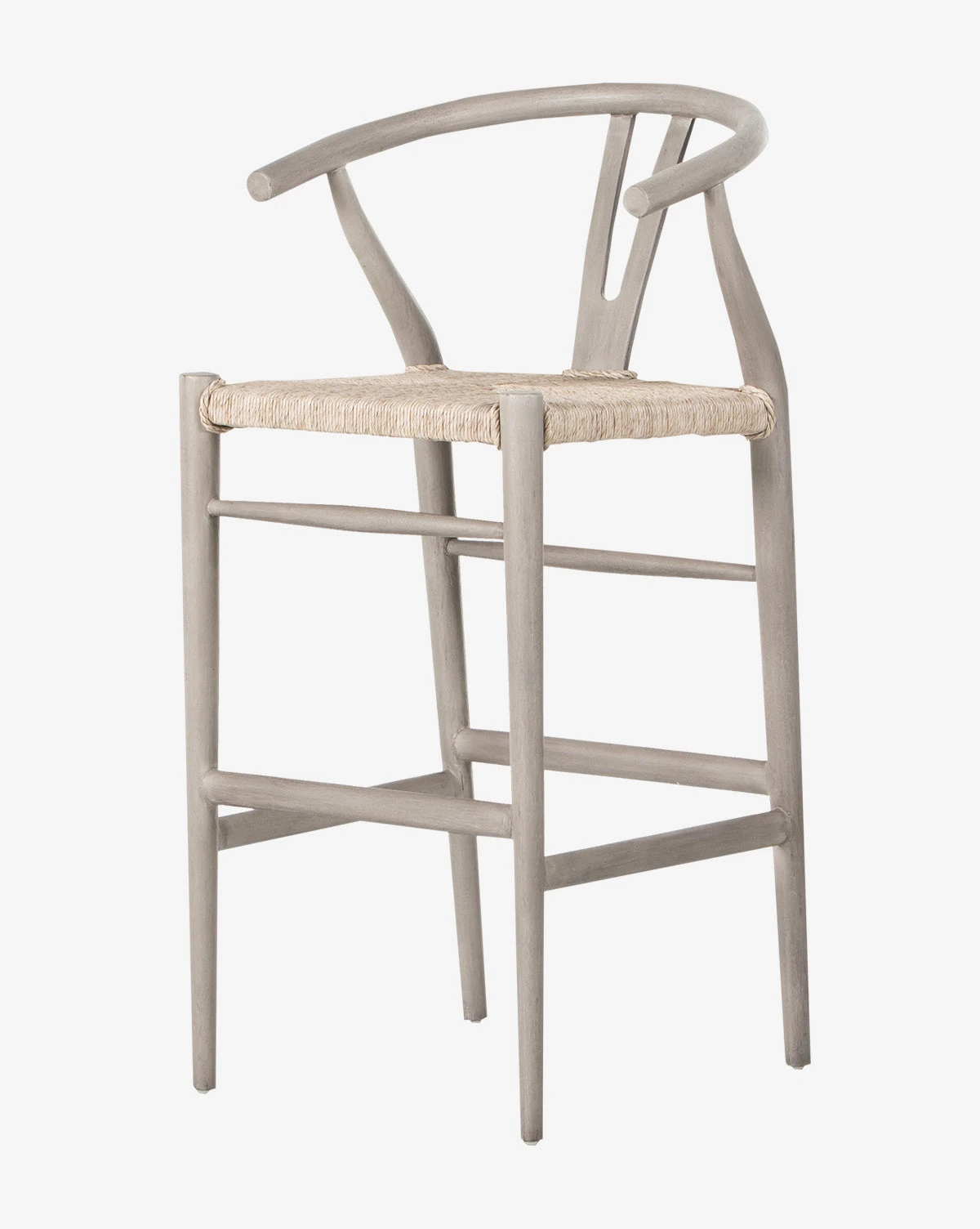 With a wishbone style back and modern curves, the teak-framed Jasper Stool makes a statement wherever it’s placed. Horizontal bars bring visual dimension to its base, as a woven wicker seat adds refined texture, finishing off the design.