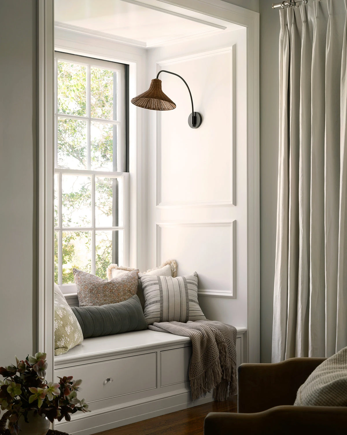 Featuring a streamlined yet organic bell-shaped shade woven from natural rattan, the Johanson Woven Sconce is plated in a contrasting antique bronze finish and swivels 140-degrees. Seamlessly blending modern shapes with textural materials, this sconce brings an organic, airy tone everywhere from hallways to bedrooms.