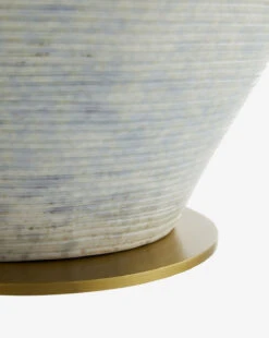 Handcrafted porcelain is the hallmark of the stunning, oversized Kara Table Lamp. Finished in an Adriatic mist glaze and featuring soft purple speckling, the ridged texture of this table lamp layers nuance into its elegant style. An off-white linen shade with off-white cotton lining completes the piece, topped with an antique brass sphere finial. The finish of each piece will vary slightly.