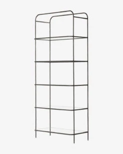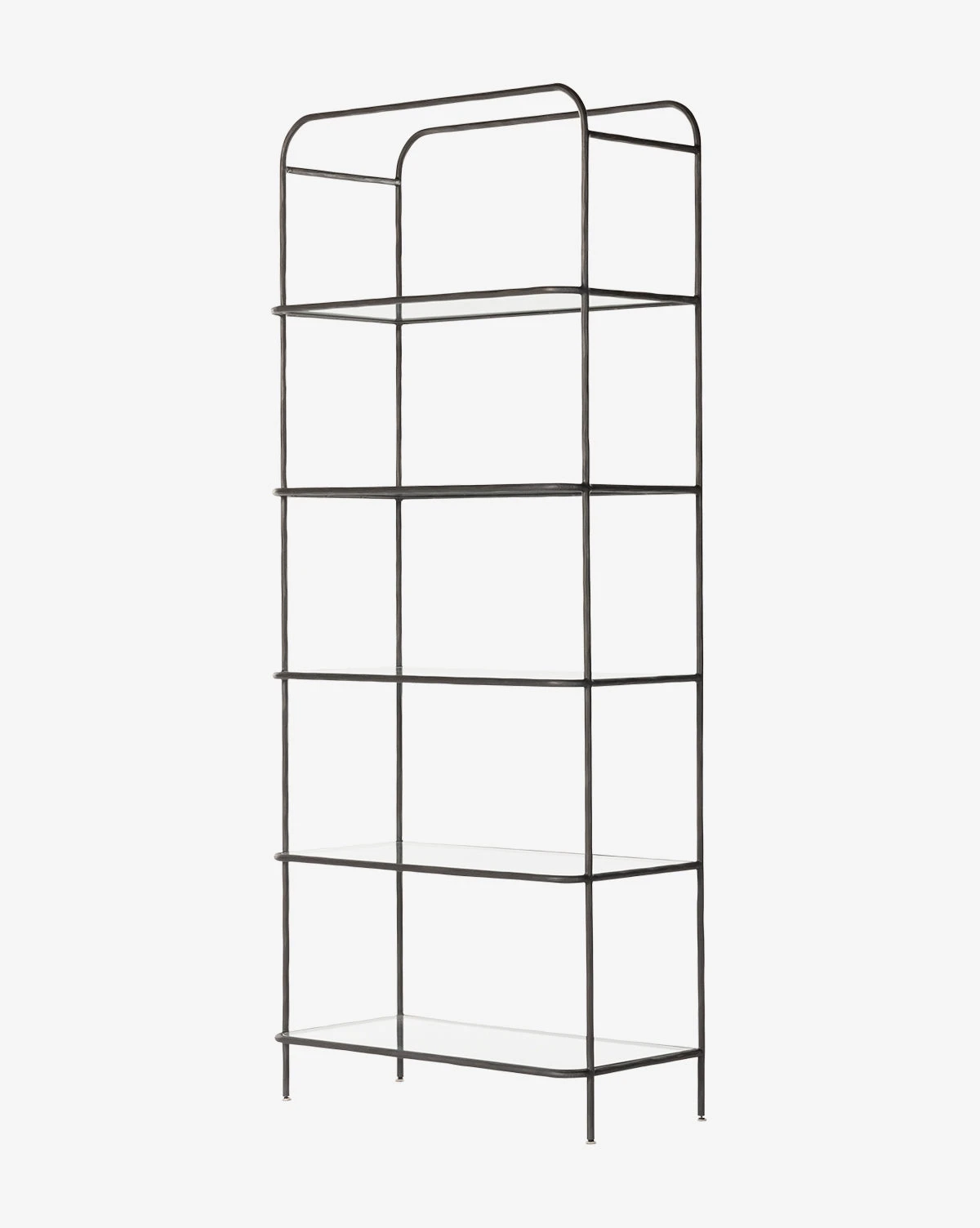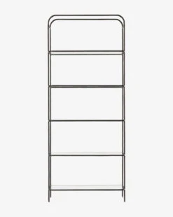 Sleek and open, the Kellen Bookcase is a sophisticated, strong piece crafted from iron in either a brass or gunmetal finish. Its simple frame holds tempered glass shelving, perfect styling everything from books to decorative pieces.
