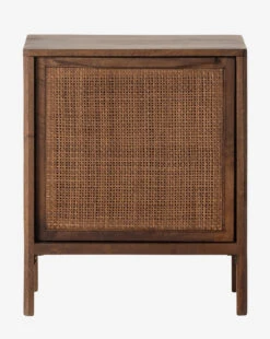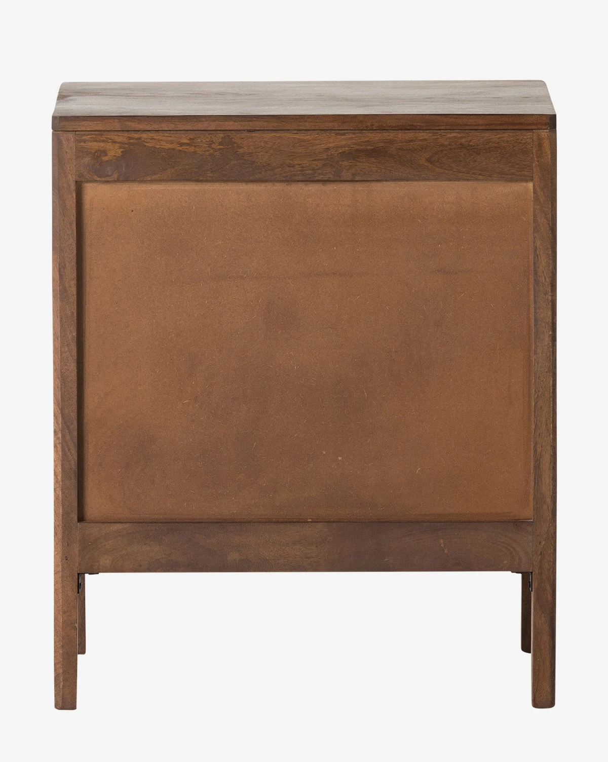 Crafted from solid mango wood, the Kenan Brown Nightstand beautifully mixes materials in a simple design. Subtle details elevate the presence of this nightstand, with the brown-washed, smooth frame contrasted by the inset woven cane on the door.