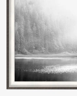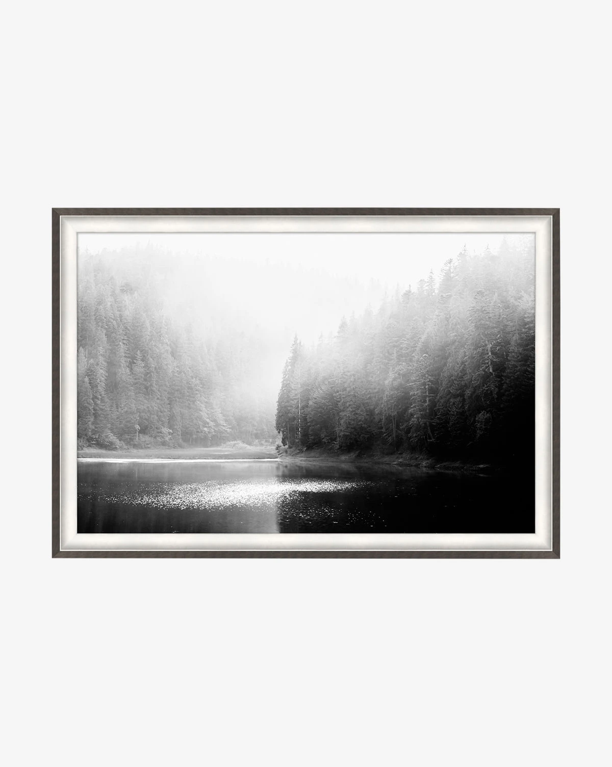 Moody and serene, this giclee print brings the winding forest and river to your front door with its all encompassing black and white depth. Styled over a console, or making a statement layered on your mantle, its large form is encased in a simple, sophisticated black frame adding to its timeless display.