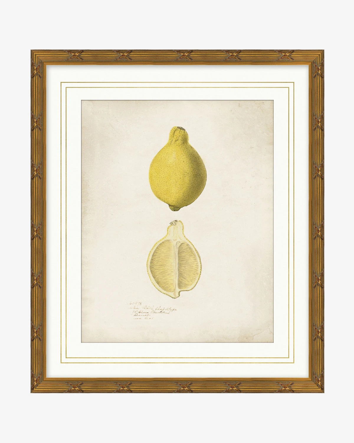 With the feel of classic illustration, color and texture take center stage in Lemon Study. The richly colored fruit stands out against the neutral background, as a good wood frame draws the eye wherever it is styled.