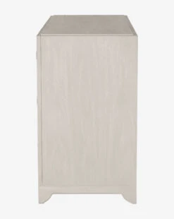 The Lilah Dresser features a classic look and feel with its straightforward structure and subtle details. Made from mindi wood, the dresser has a cerused white finish that only highlights the beautiful iron circular hardware. The slightly raised top and semicircular feet add dimension and playfulness to this piece.