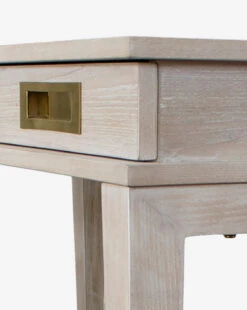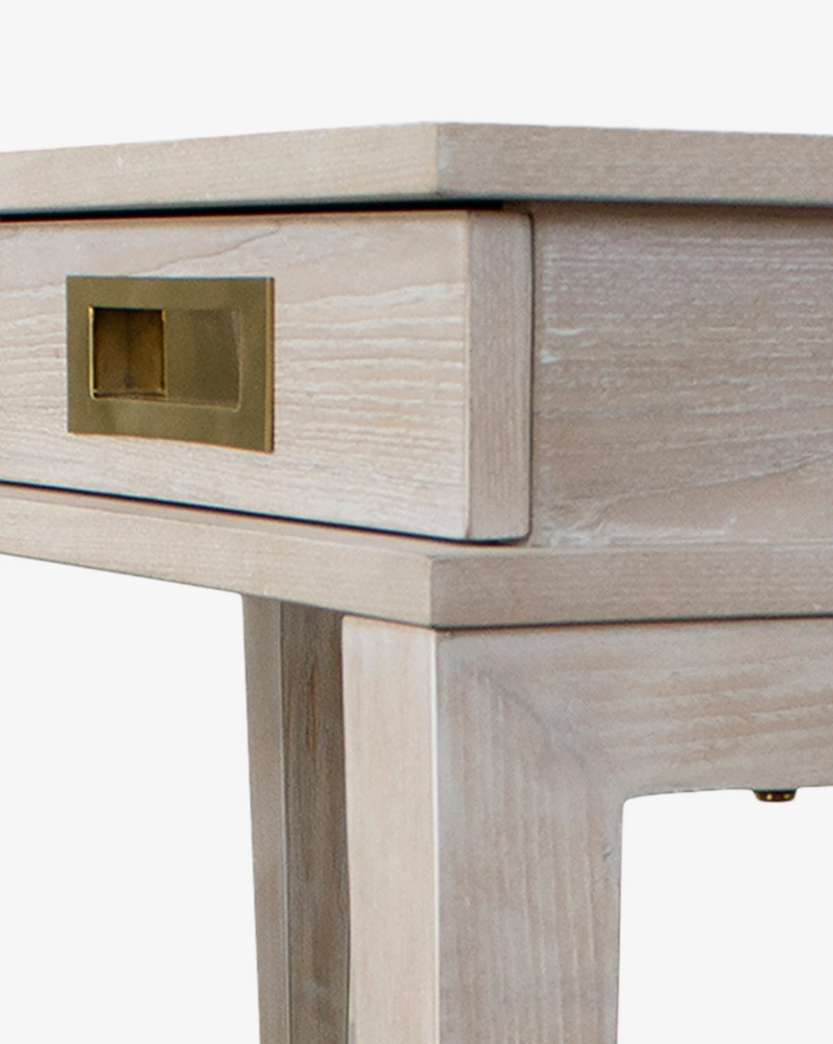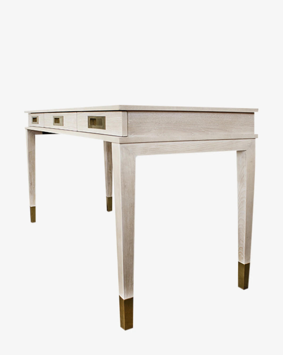 This traditional campaign style desk is given a modern update with a sleek cool hue and elegant antique brass feet caps. Transitional and versatile in style, let this desk add just the right amount of dimension to your home office.