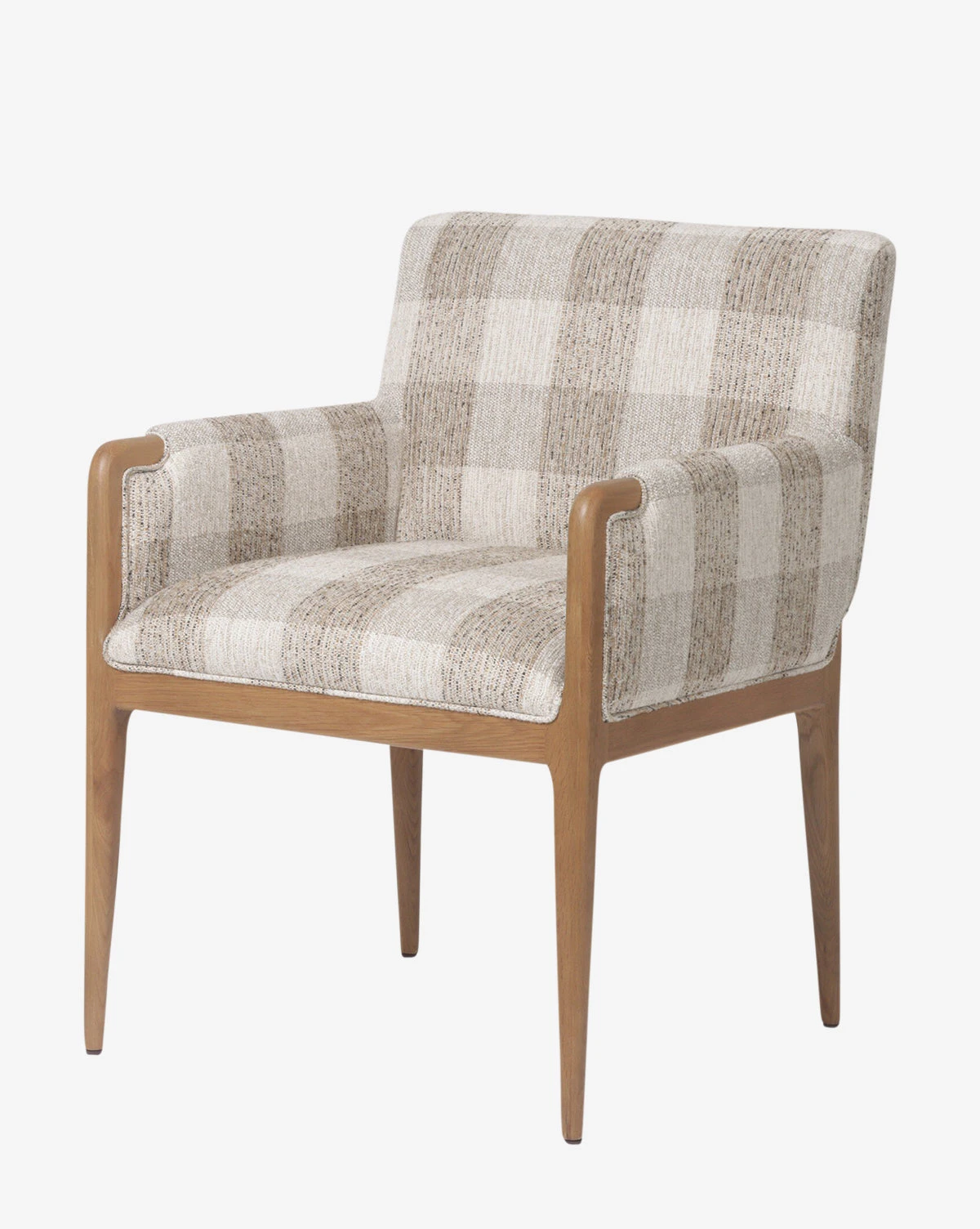 The Maebh Dining Chair features a warm oak solid frame paired with plaid upholstery, offering a blend of comfort and timeless style. The chair is a versatile piece for both casual and elegant settings.