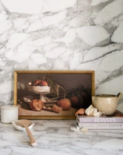 A poignant still life, this painting depicts even the most simplistic moments of beauty. From the ripe orange mandarins to the scalloped ceramic bowl, this piece lends effortlessly elevated style to your space.