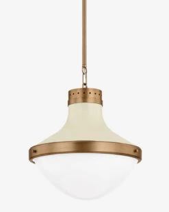 In a unique shape, the Maxton Pendant brightens up your space. Its opal glossy glass allows for a soft, diffused light, while the patina brass hardware adds elegant detail to the fixture.Â