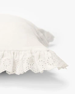 The Delilah Broderie Trim Pillow Cover is made from white linen with a delicate broderie border. Designed in collaboration with Loeffler Randall, this piece brings a considered aesthetic to your home with every detail.Â