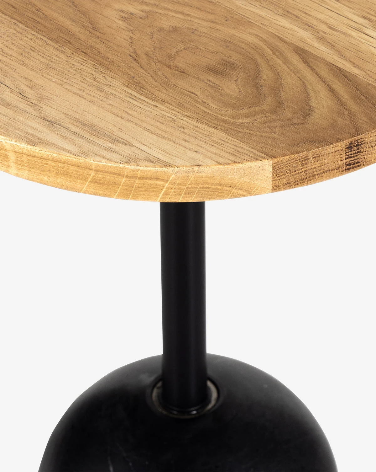 Petite in size but big in impact, the Mertice Side Table is crafted from a mix of materials that lends a soft approachability to its modern design. A black-finished solid marble base is topped with a slim iron post that holds a natural oak tabletop, creating a warm tone that accentuates your space.