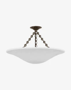 With a bold and contemporary design, the Mollino Semi-Flush Mount is crafted from polyresin with a white plaster finish. Its hand-rubbed antique brass chain lends a subtle contrast to the shade, adding beauty to lighting designs throughout the home.Â
