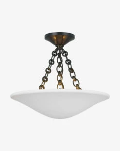 With a bold and contemporary design, the Mollino Semi-Flush Mount is crafted from polyresin with a white plaster finish. Its hand-rubbed antique brass chain lends a subtle contrast to the shade, adding beauty to lighting designs throughout the home.Â