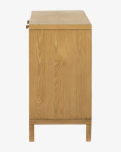 Natural caning and honey-finished oak give the Mora Sideboard its endearing mid-century style. Behind doors of inset, arched caning detail sits roomy interior shelving and rear cutouts for cord management. Completed with a block wood handles, the Mora Sideboard highlights natural textures and material for an elevated take on a playful piece.