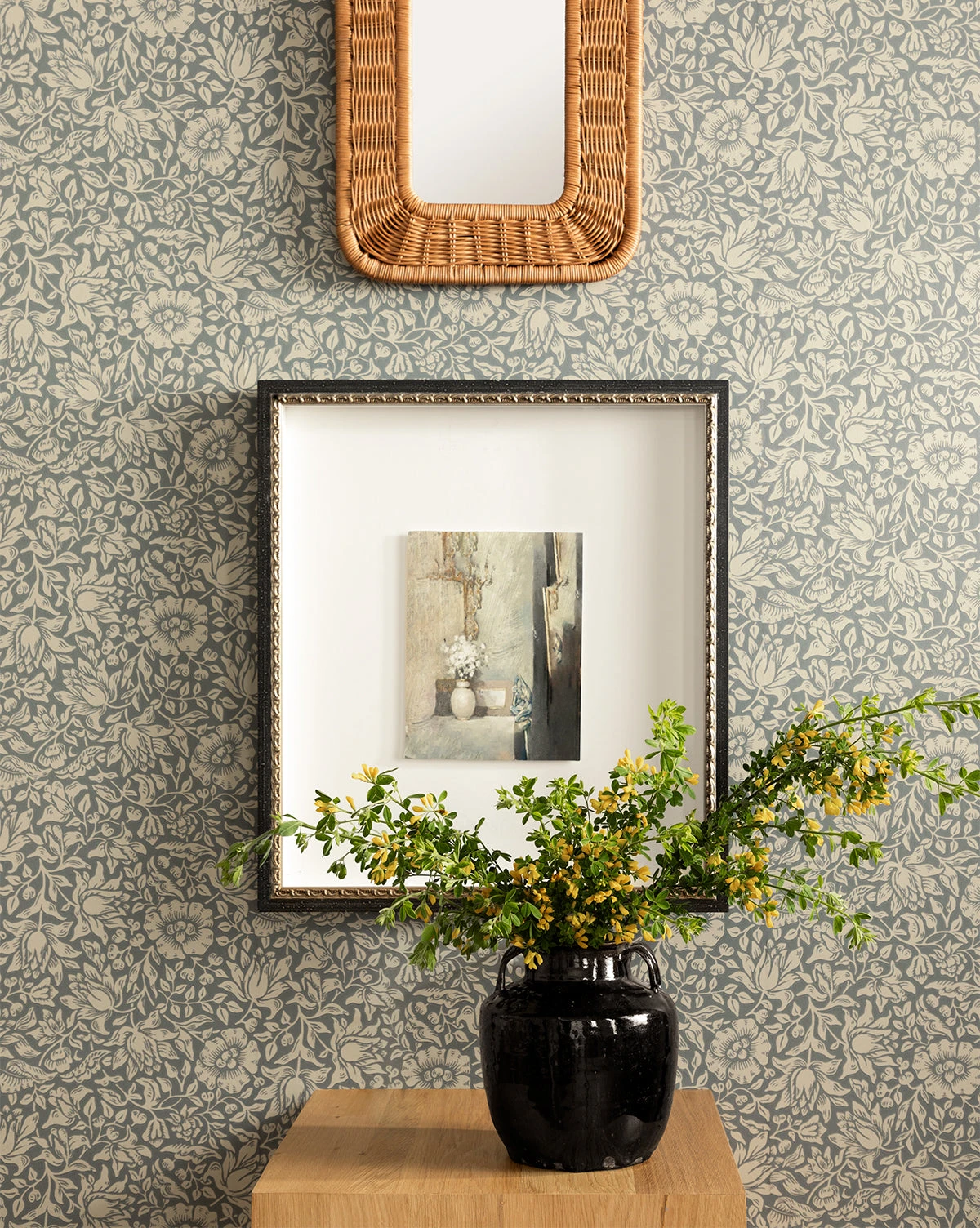 The Mallow Wallpaper is a signature and historic Morris & Co. pattern reimagined in a new color palette, created exclusively for McGee & Co. in collaboration with Shea McGee. The intricate motif is full of movement, featuring a floral design in cool tones.