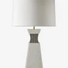 With a minimalist column shape and bronze details, the Nashik Lamp is simple yet elegant, reminiscent of a warming candlestick. Topped with an off-white microfiber shade, light plays off the alabaster body to light your console or side table with a welcoming and modern feel.