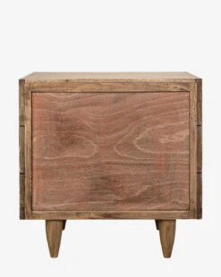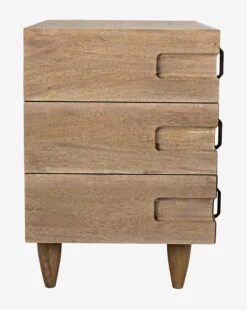 The Dexter Nightstand goes against the grain of its natural walnut make with a contemporary design. Â Carved details at the corners add dimension to its boxy shape, while vertical black metal hardware add an eclectic touch to its natural wood origins.