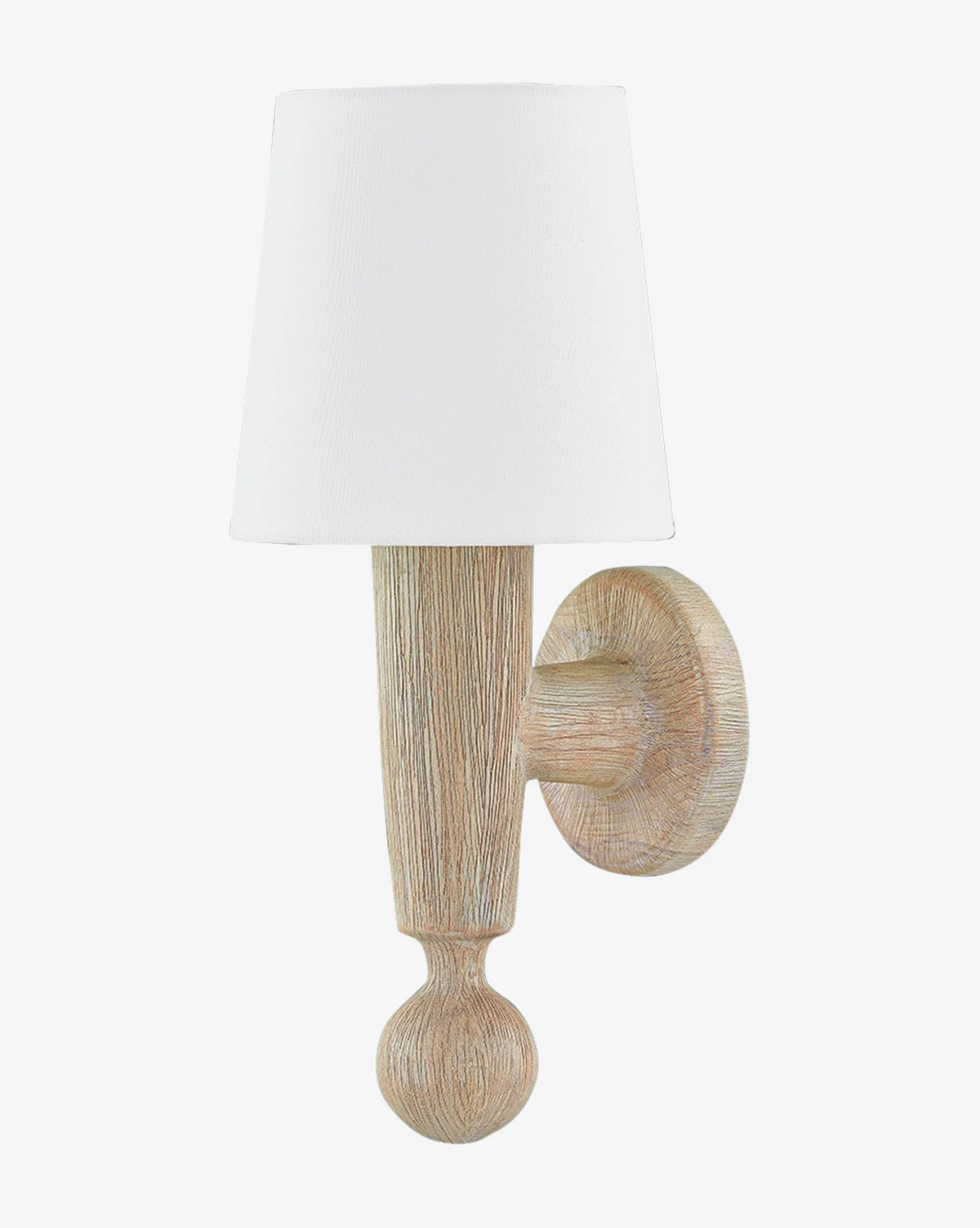 Handcarved from cerused whitewash wood, the Nola Sconce brings natural texture and a one-of-a-kind touch to your home lighting. The gentle yet dynamic base is paired with a simple linen shade. With neutral tones and a versatile design, it complements a wide range of interior styles.