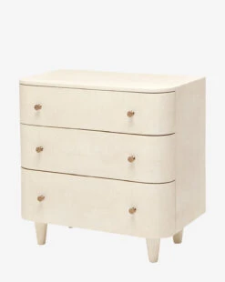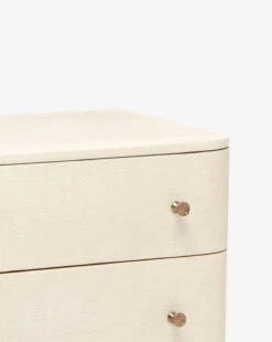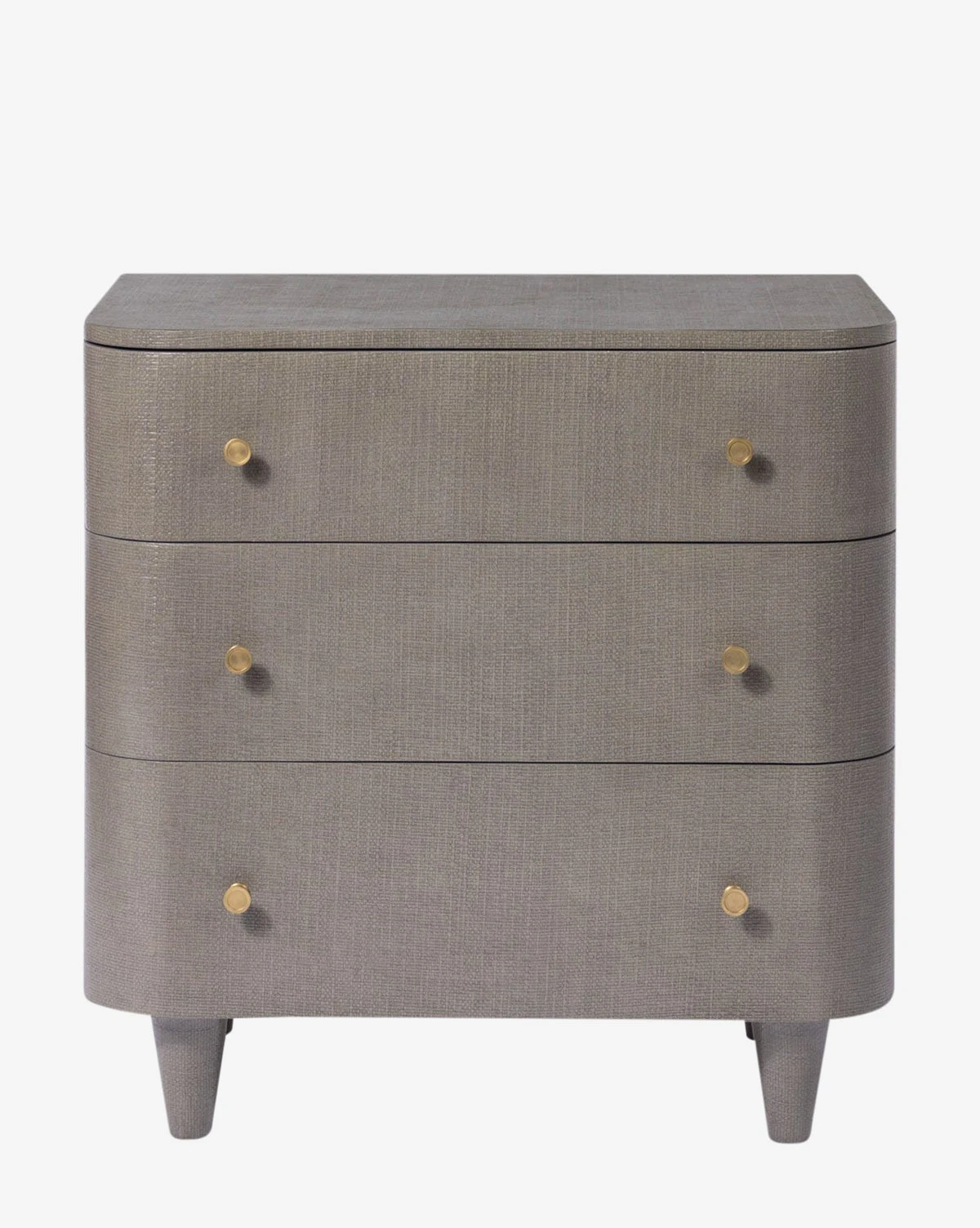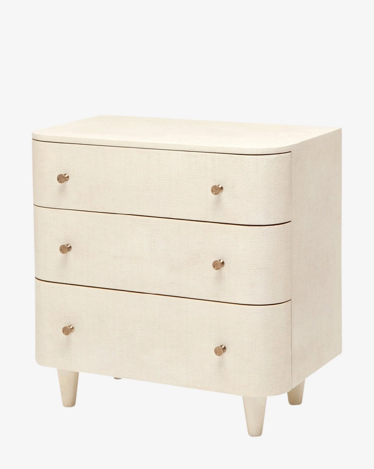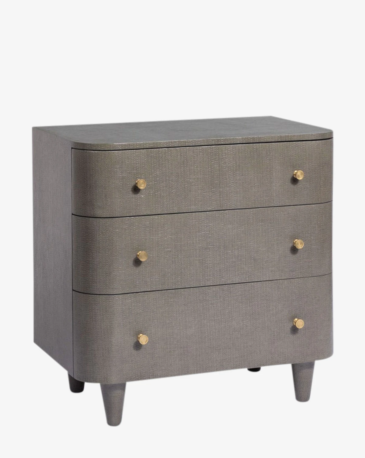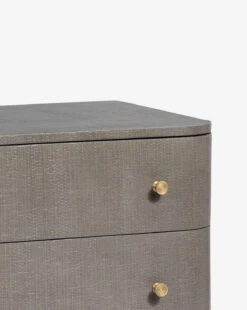 Covered in hand-stamped faux rafia, the Olinda Double Nightstand brings modern detail to classic bedroom furniture. Simple brass pulls add refined detail to the two drawers, displaying the nightstand’s thoughtful design.