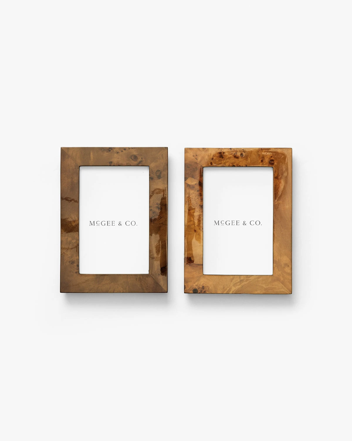 Showcase your favorite memories and elevate your home decor with this set of Oliver Burl Frames. Crafted with burl wood veneer and a high-gloss lacquered finish, these frames exude natural beauty and sophisticated warmth. Backed with an easel prop stand and easy to display in either portrait or landscape orientation, it offers versatile styling options.