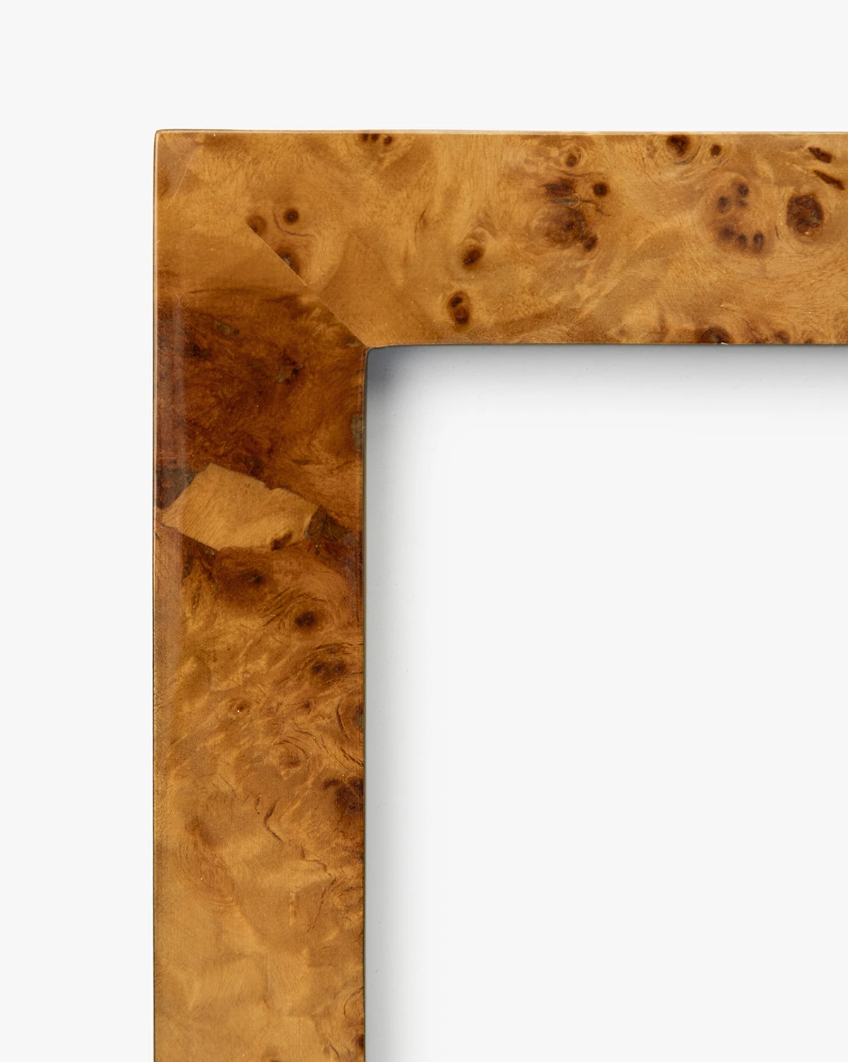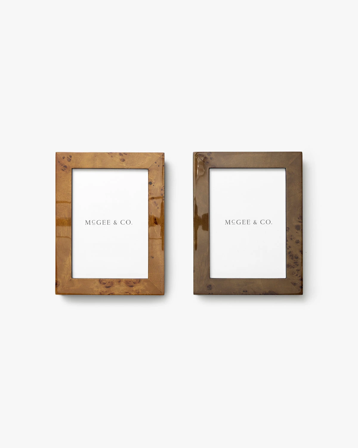 Showcase your favorite memories and elevate your home decor with this set of Oliver Burl Frames. Crafted with burl wood veneer and a high-gloss lacquered finish, these frames exude natural beauty and sophisticated warmth. Backed with an easel prop stand and easy to display in either portrait or landscape orientation, it offers versatile styling options.