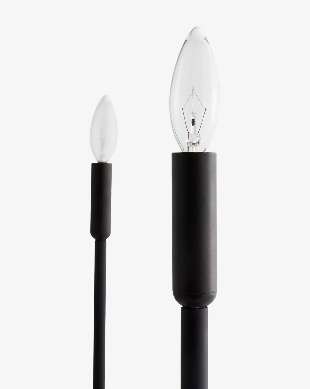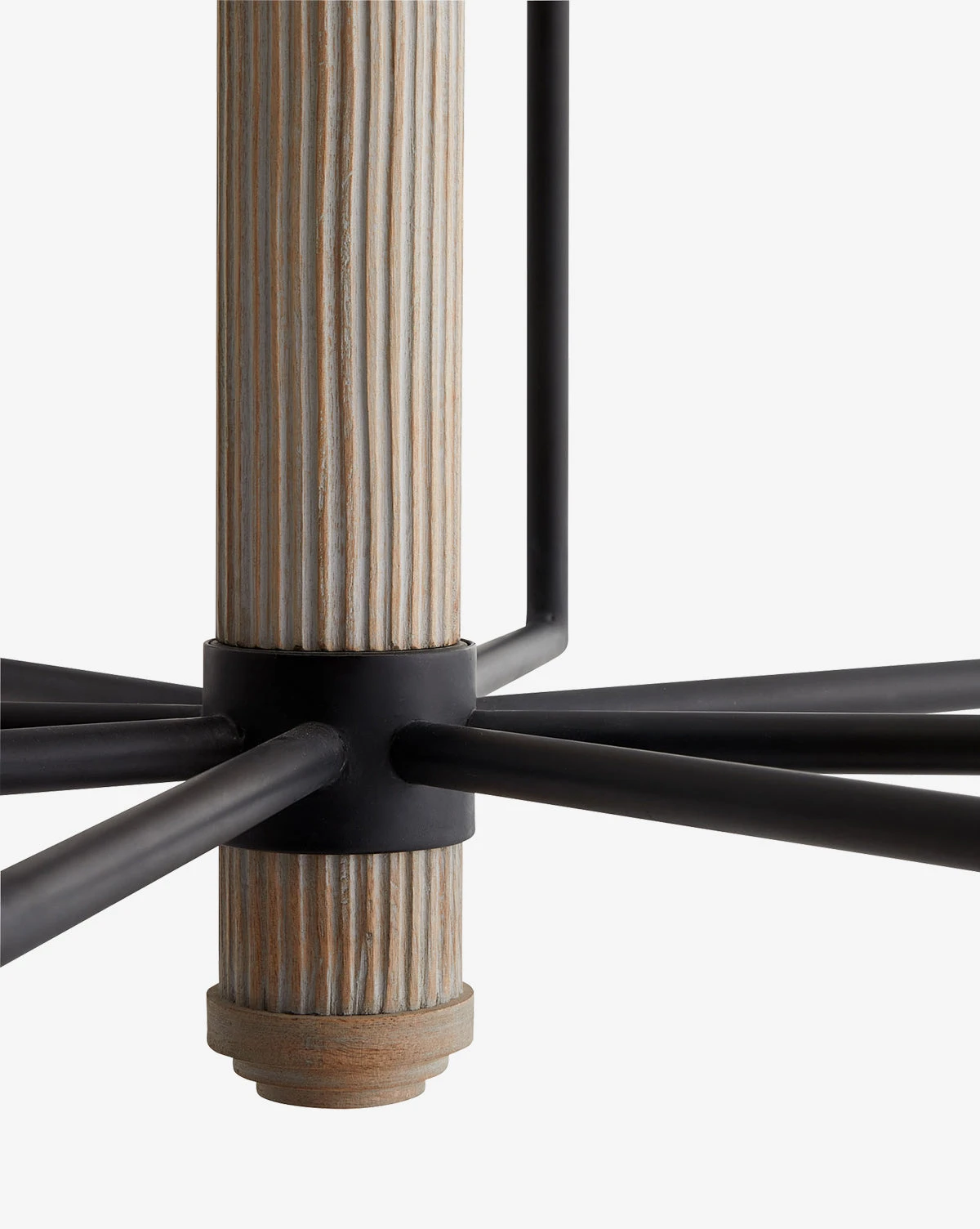 Playing with traditional shape and industrial materials, the Orlando Chandelier features a natural driftwood column for an organic detail. The eight lights on the streamlined blackened iron candelabra silhouette provide warm light to an open room.