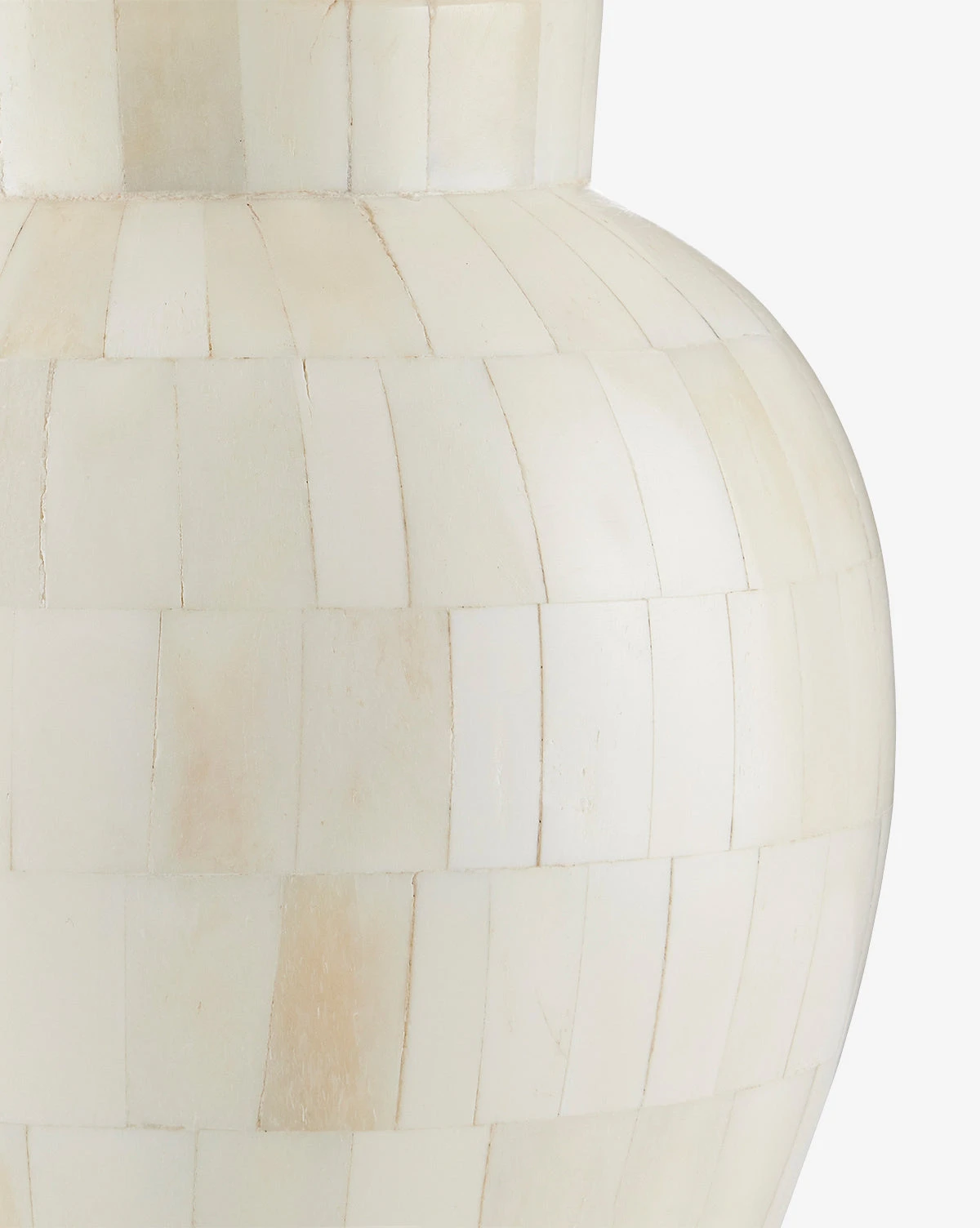 Handcrafted in India from wood and ivory, the Osso Round Table Lamp is petite in size but large in impact. The body of the lamp is an urn-shaped form clad in a bone-on-bone inlay with a finial accent and a white shade that adds a soft, luxurious feel to this textural, organic design. Each bone is cut by hand to give the piece its seamless feel, creating a unique look that can’t be replicated.