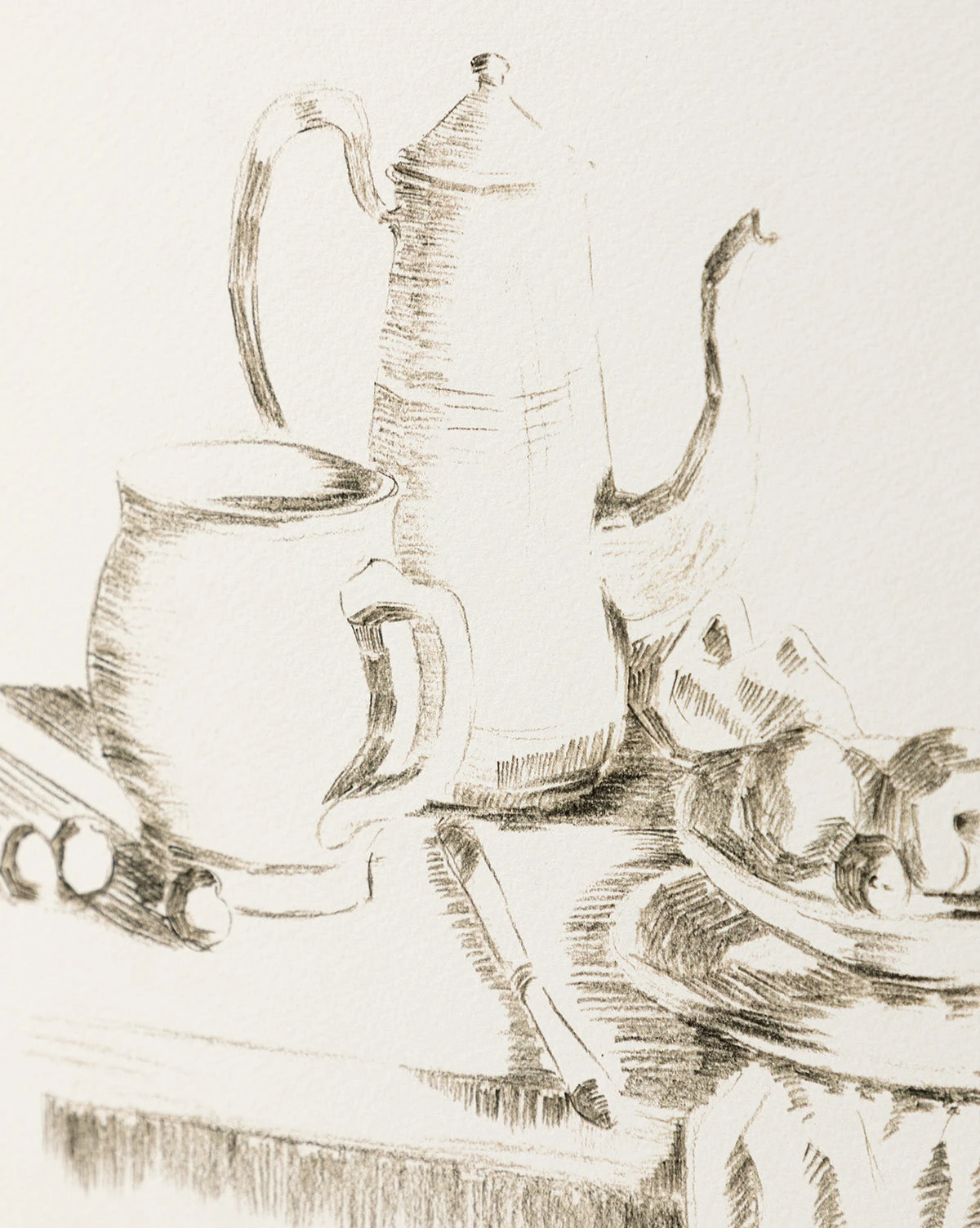 With expressive linework and a full composition, Penciled Apricots has a delicate yet inviting feel. The still life depicts a table setting with pitchers, textiles, and a bowl of apricots. With a gold-finished frame, the piece brings gallery-quality materials to your space.