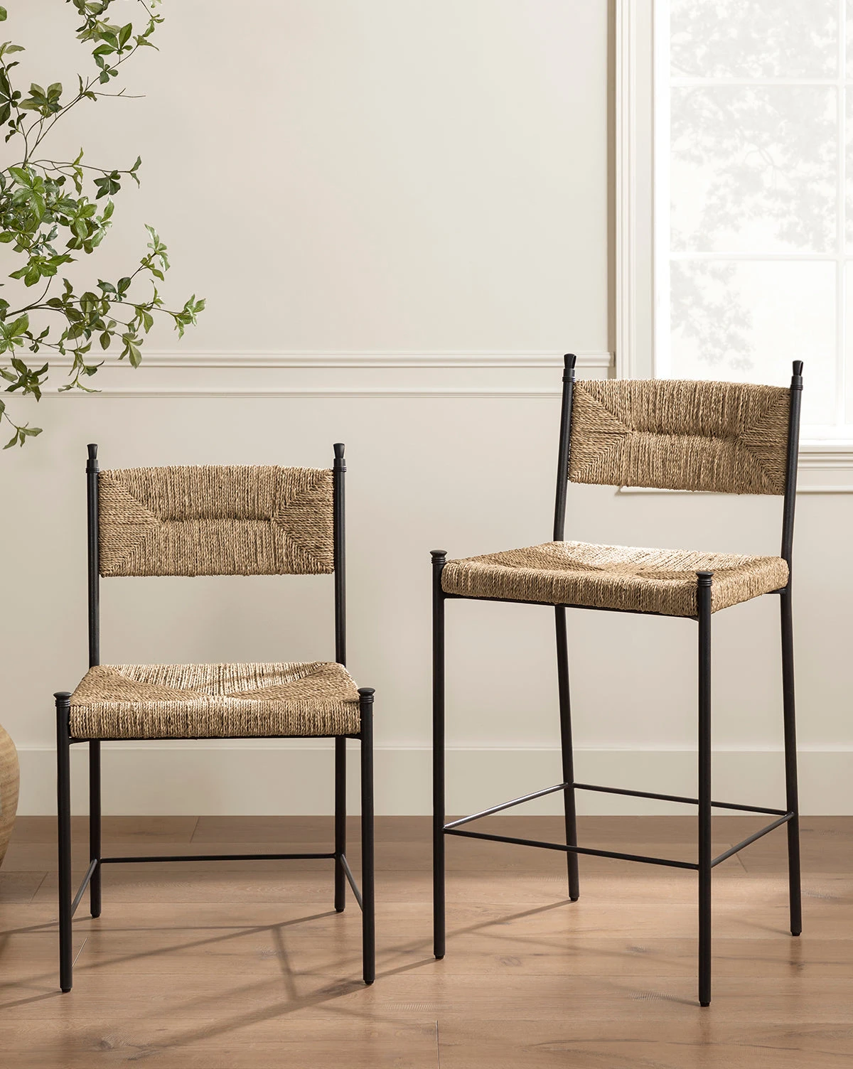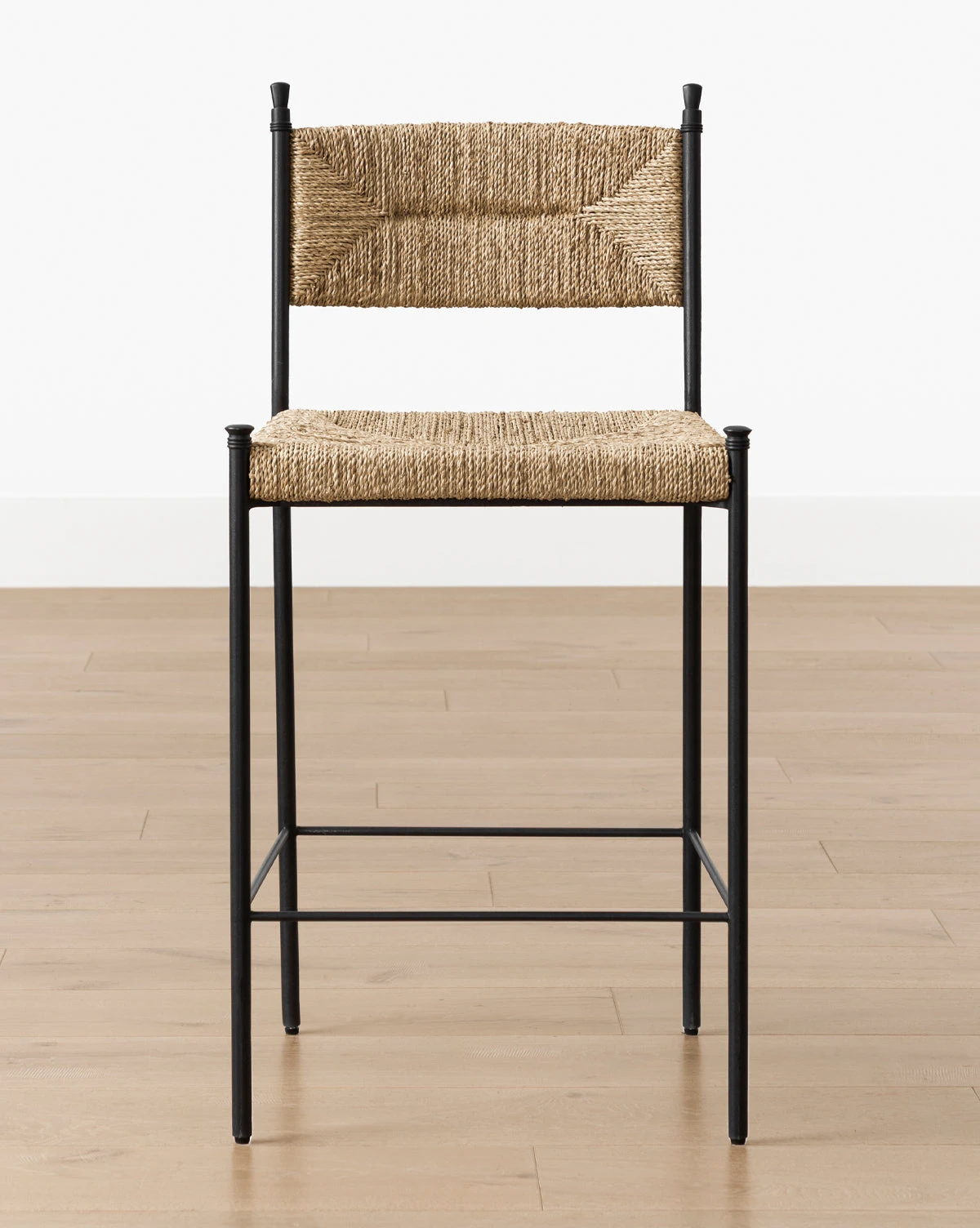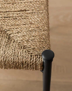 Sleek style meets natural charm. With a sturdy steel frame featuring elegant loop finials and a woven seagrass seat and back, our Peregrine Stool effortlessly elevates any kitchen or dining setting with organic texture and a sense of refinement. We designed this piece with a refined seat pitch and height for a supported and comfortable sit.