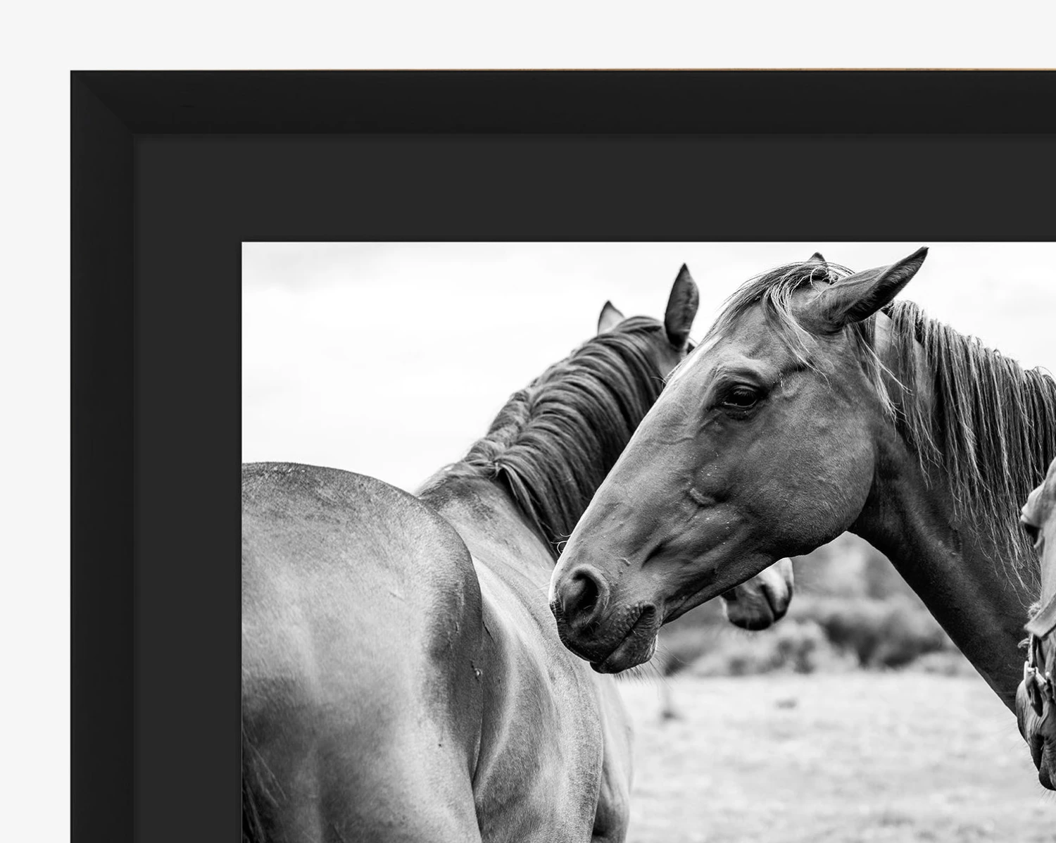A black and white giclee print on matte paper, Photograph of Horses is bold and intriguing. Floated on a single mat and presented within a black wood frame, this photograph is a museum-quality piece with timeless personality. Â
