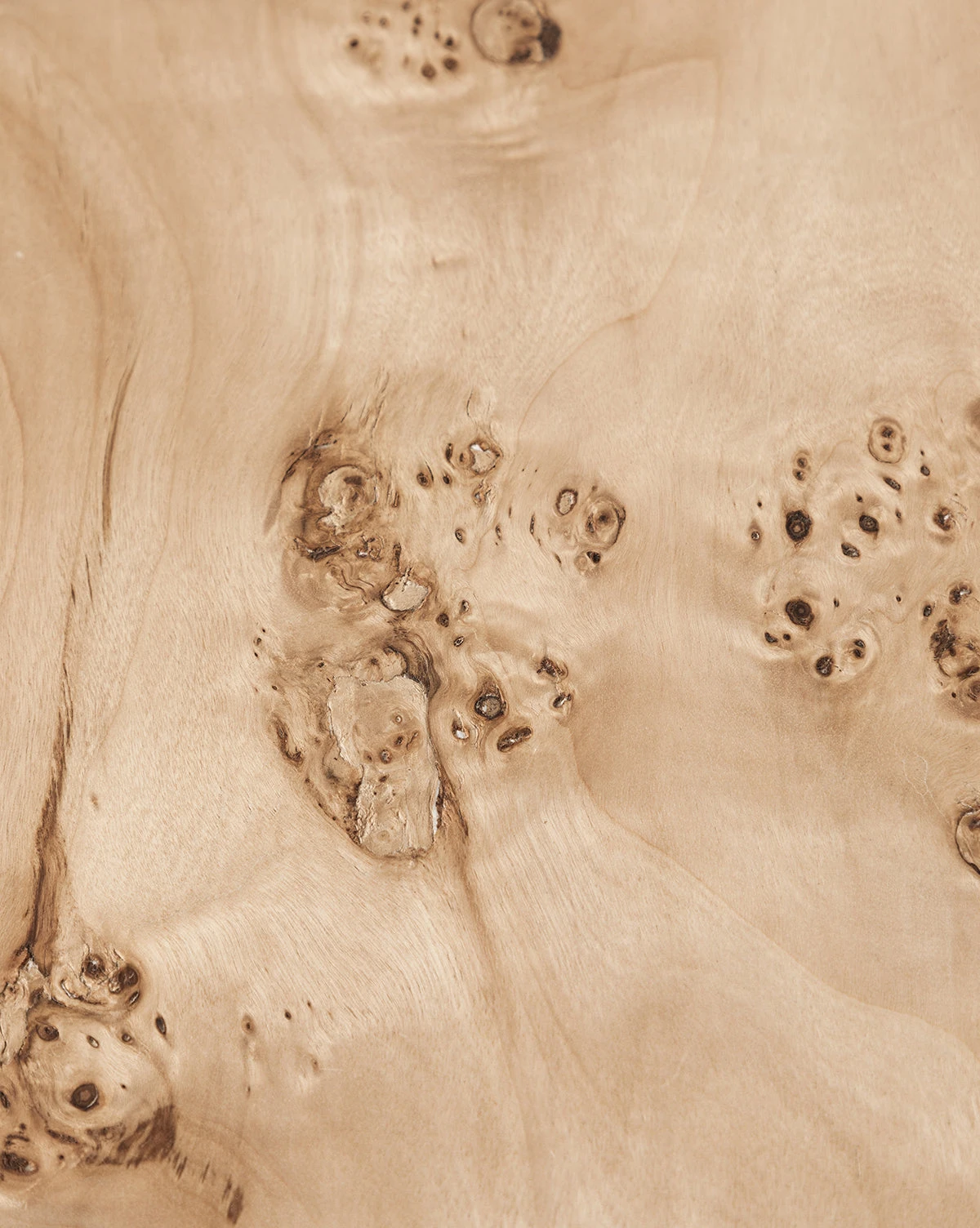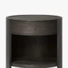 A uniquely modern take on vintage style, the Pia Nightstand is crafted from burl veneer with an antique brass knob. We designed its half-moon shape to add a romantic element of soft curves to your space, and rounded the piece out with both open-shelving and drawer storage.