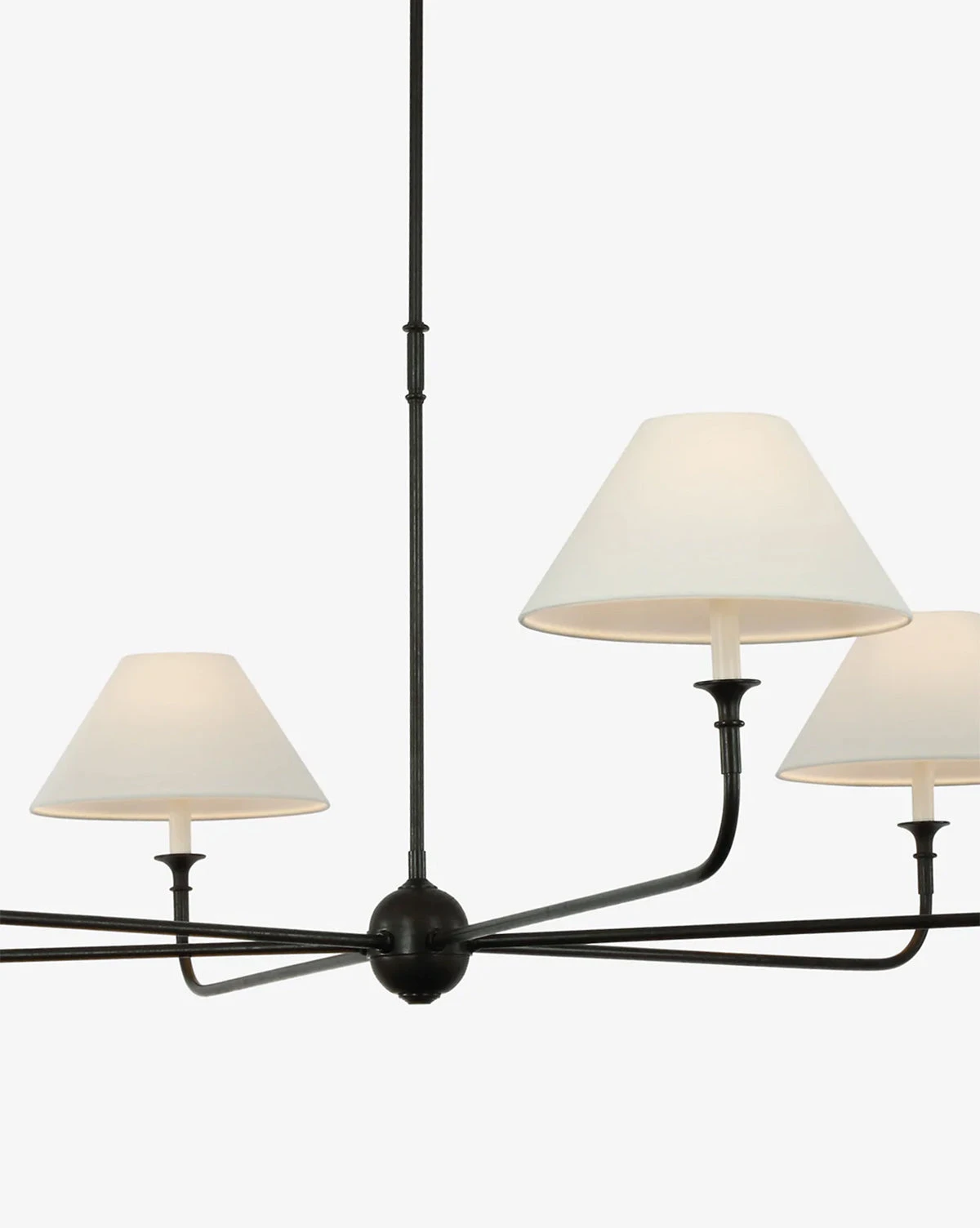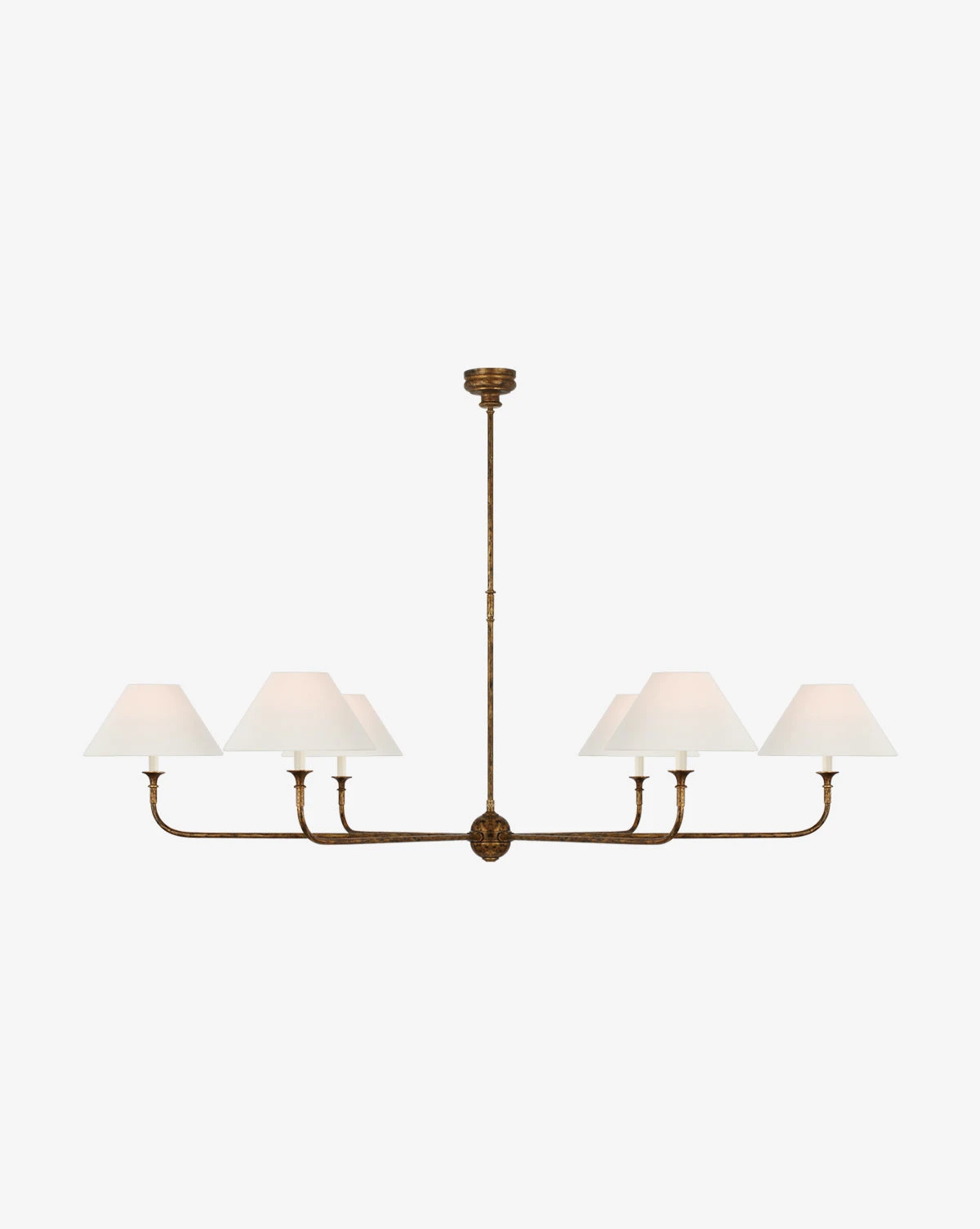 Defined by pronounced lines, the Piaf Oversized Chandelier uses a straightforward suspension and elongated arms to create distance and cohesion. Balanced by a round weight in the center of the pendant and nuanced by subtle details, the pendant elevates minimal design with a touch of tradition.