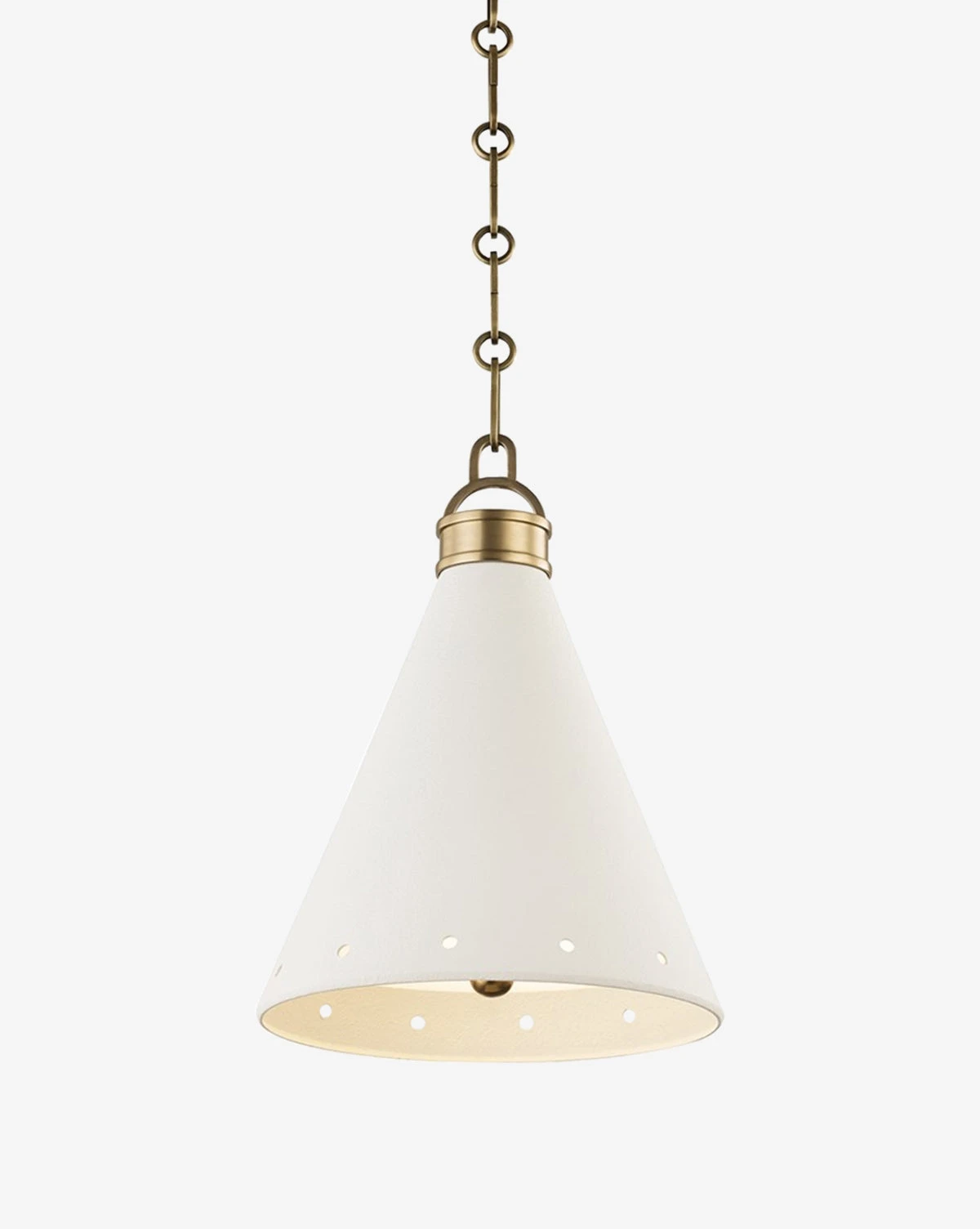 Classic and modern at the same time, this cone-shaped pendant is sure to become a fast favorite styled over your kitchen island. Circle cutouts line the rim of its steel shade to add a touch of dimension to the simple form, while aged brass details complete the design with an elegant touch.