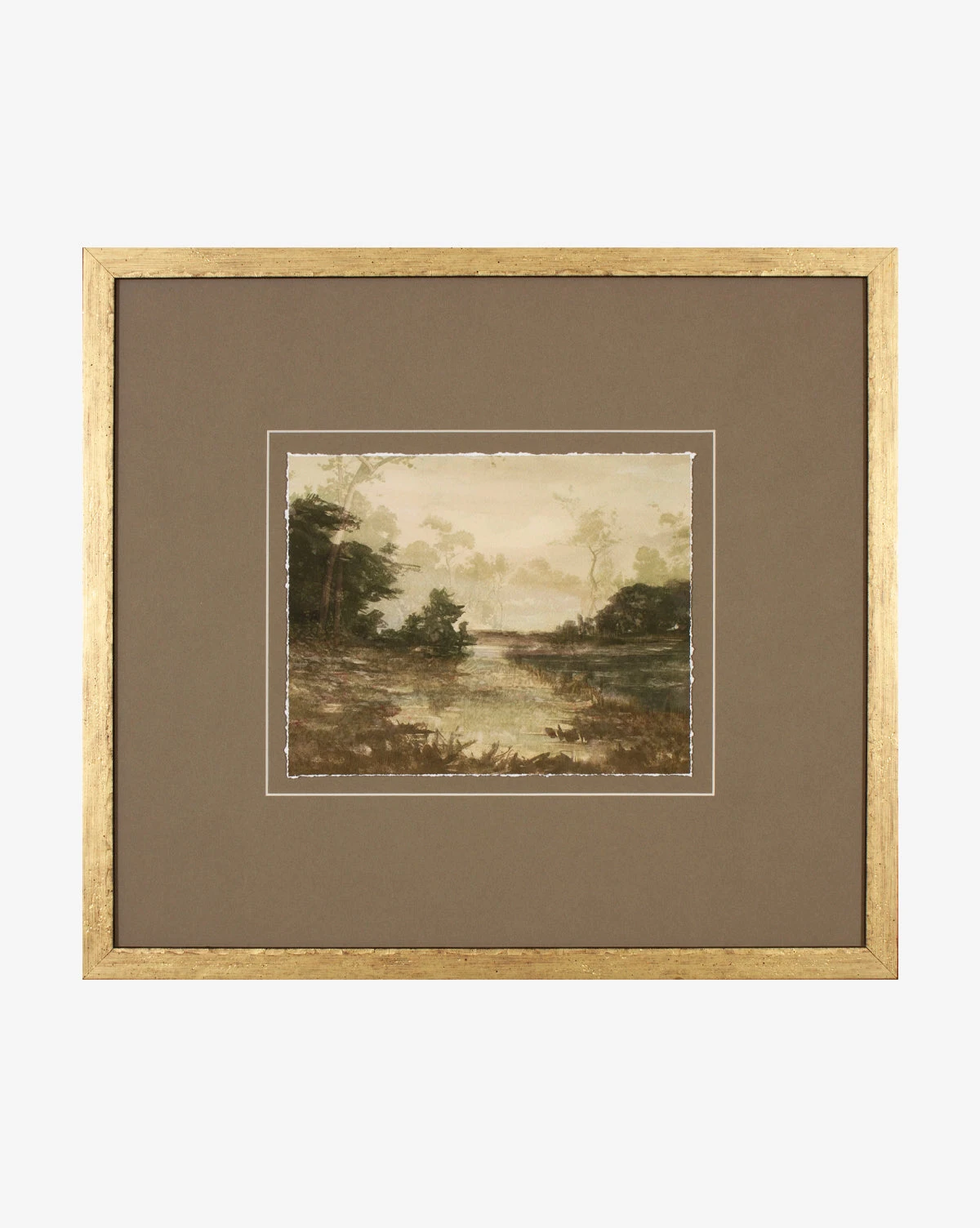A serene landscape, Pond at Sunset uses tone and texture to tell its story. A wood frame allows for versatile styling in your home, elevating wall treatments or dresser vignettes. Â