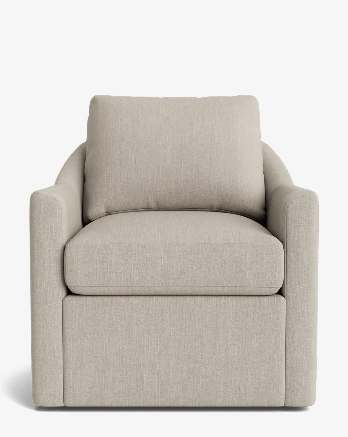 Balancing modern design with classic elements, our Quinnton Swivel Chair was designed with luxury in mind. Featuring feather blend cushions held by its bench-made frame, the swivel chair is both sophisticated and inviting. The chair is customizable in a wide array of fabrics, allowing you to personalize your space.