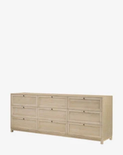 Modern functionality meets timeless style. The Raine 9 Drawer Dresser is crafted from light bleach oak veneer and features a sleek form with nine spacious drawers, offering ample storage and a natural yet refined aesthetic. This piece is built to comply with the STURDY Act, ensuring stability and safety for peace of mind.