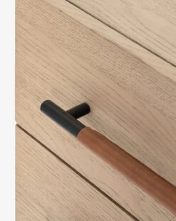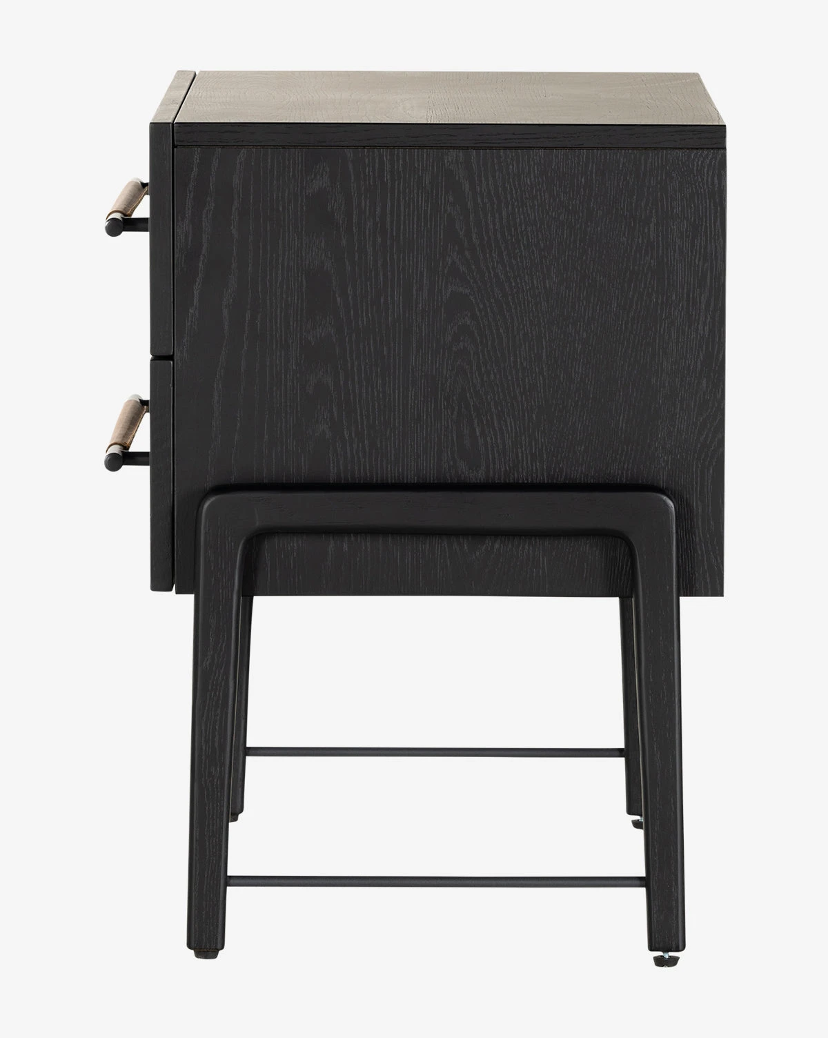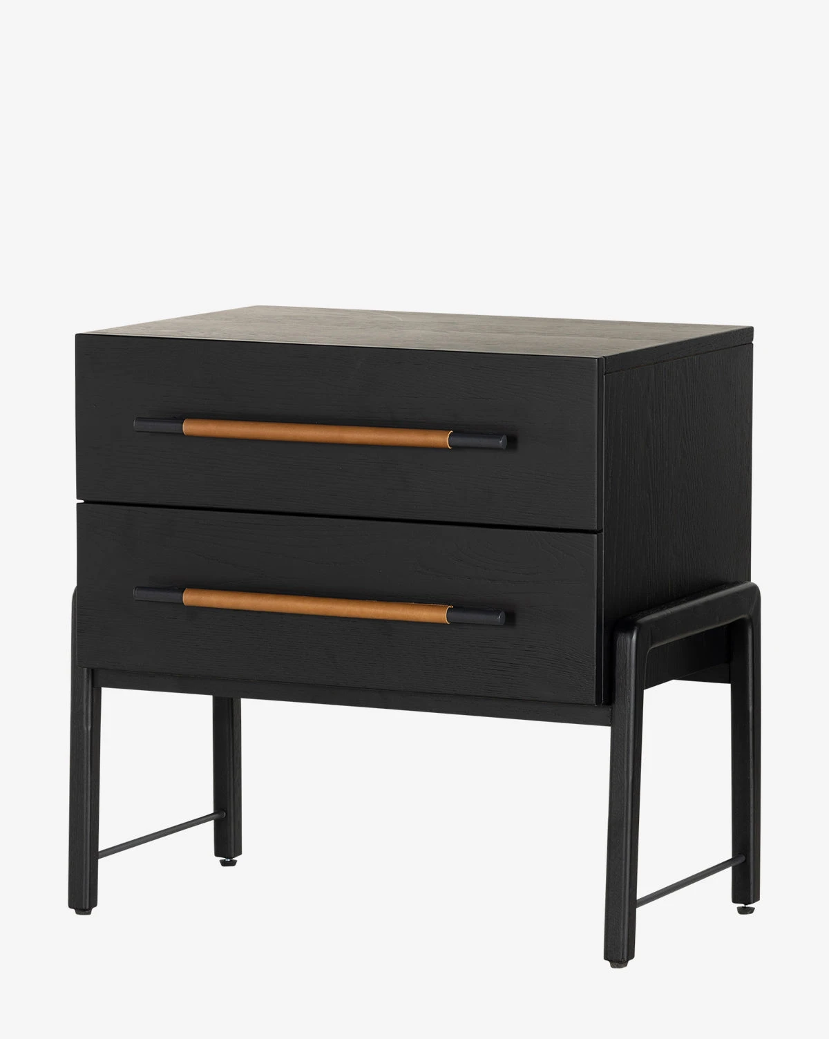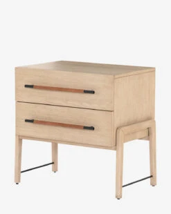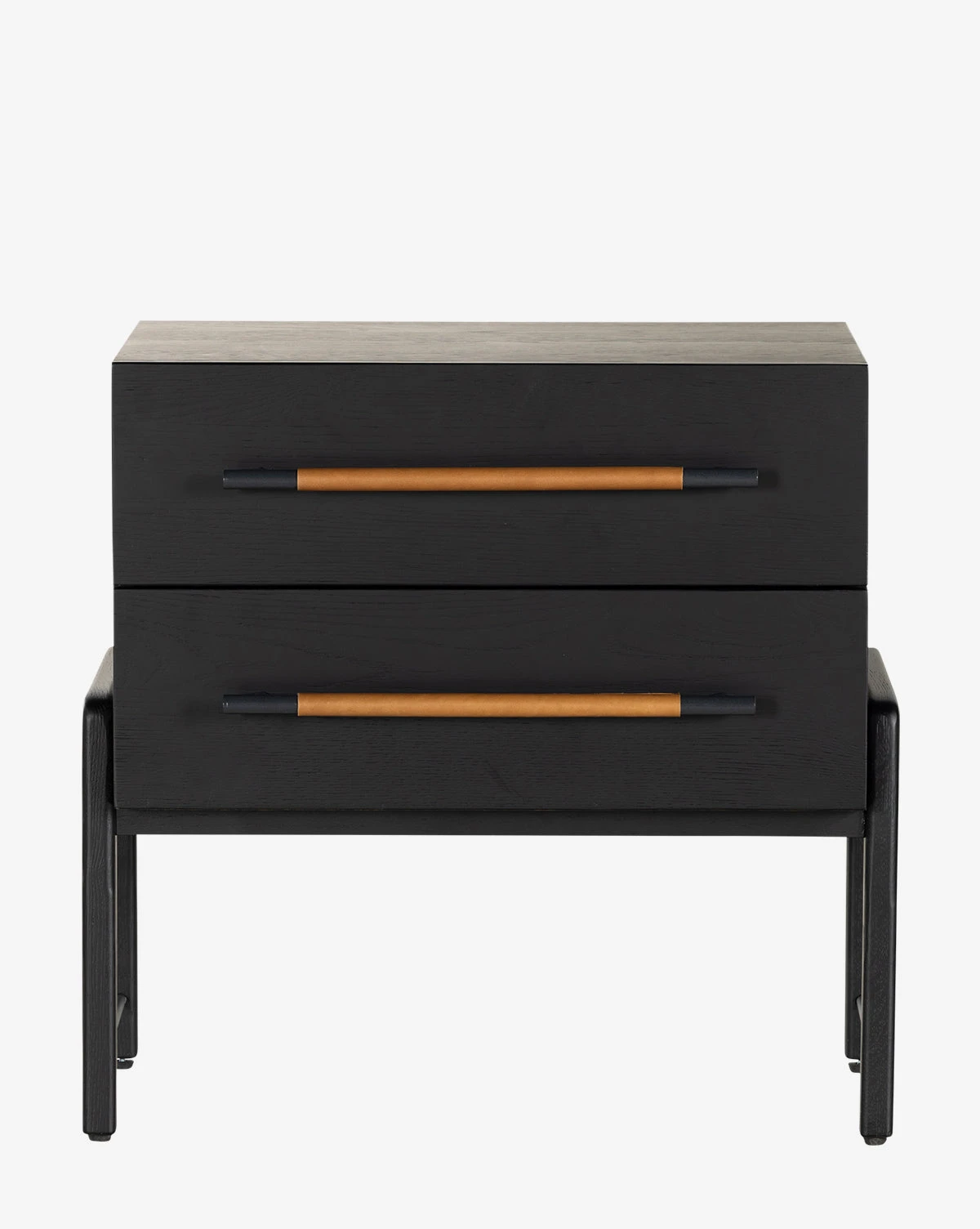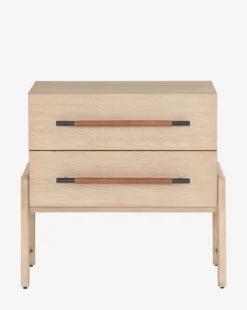 Featuring a stunning material mix, the Ralston 2-Drawer Nightstand brings both form and function to your bedroom design. Crafted with a light-finished oak frame, this nightstand is finished with iron hardware wrapped in tan top-grain leather creating a sophisticated look and feel.
