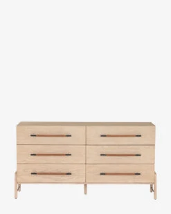 Featuring a stunning material mix, the Ralston 6-Drawer Dresser brings both form and function to your bedroom design. Crafted with an oak frame, this dresser is finished with iron hardware wrapped in tan top-grain leather creating a sophisticated look and feel.