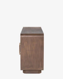 Crafted from a mixture of solid mahogany and mahogany veneer, the Ramsay Sideboard features a warm espresso hue, and eye-catching shape. Finished with handles crafted of mahogany and antique brass finished iron, this sideboard effortlessly elevates your space while lending plenty of extra storage.