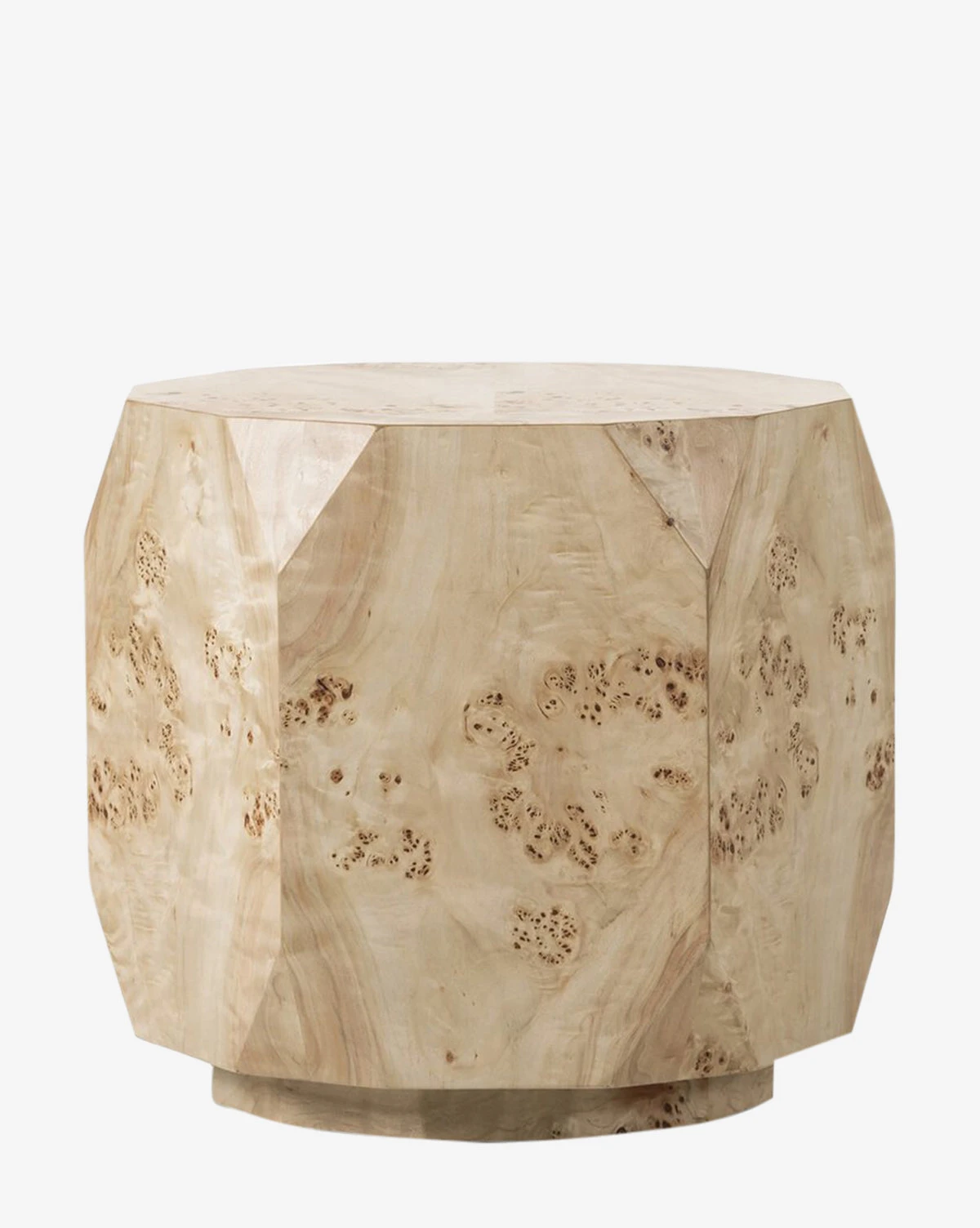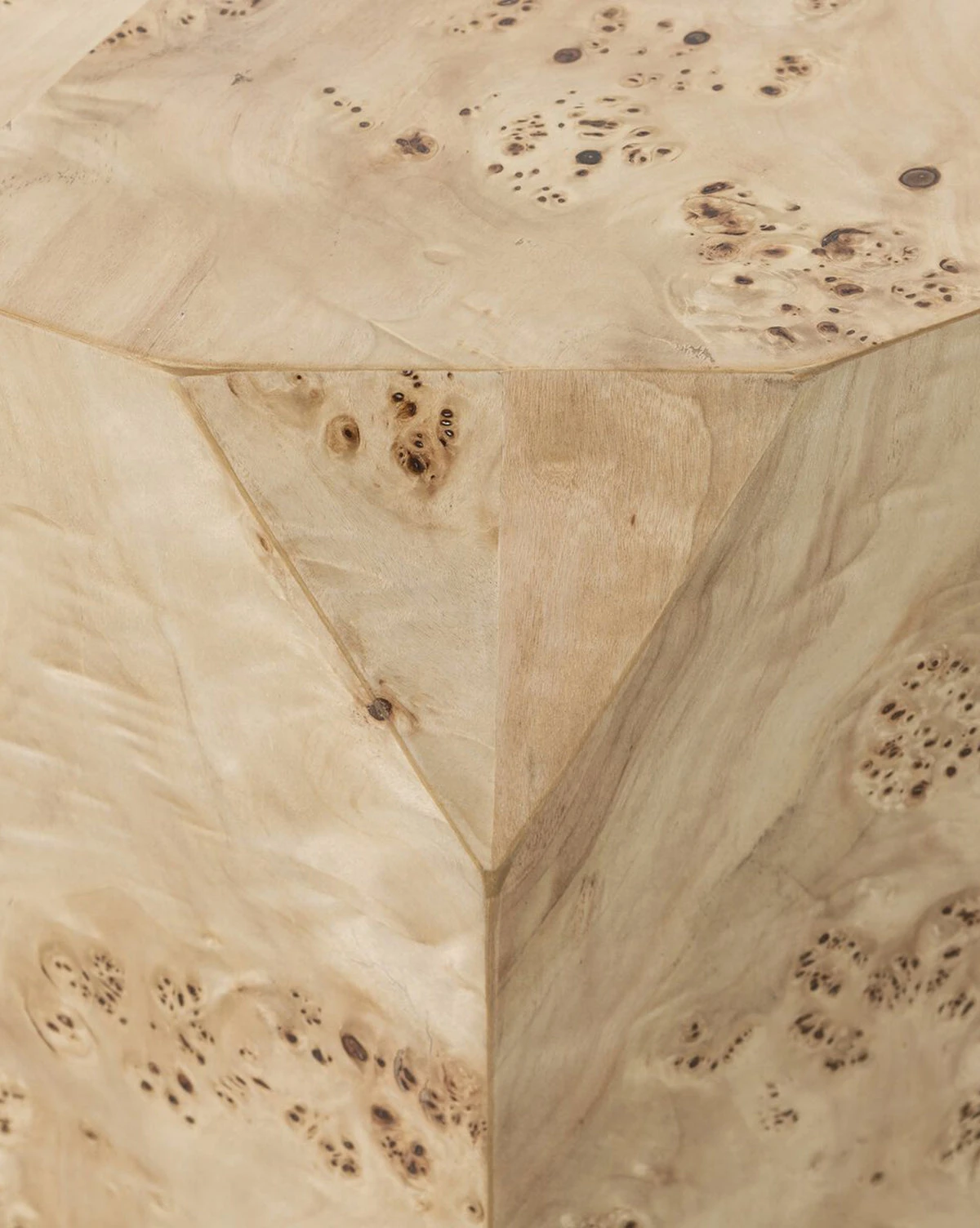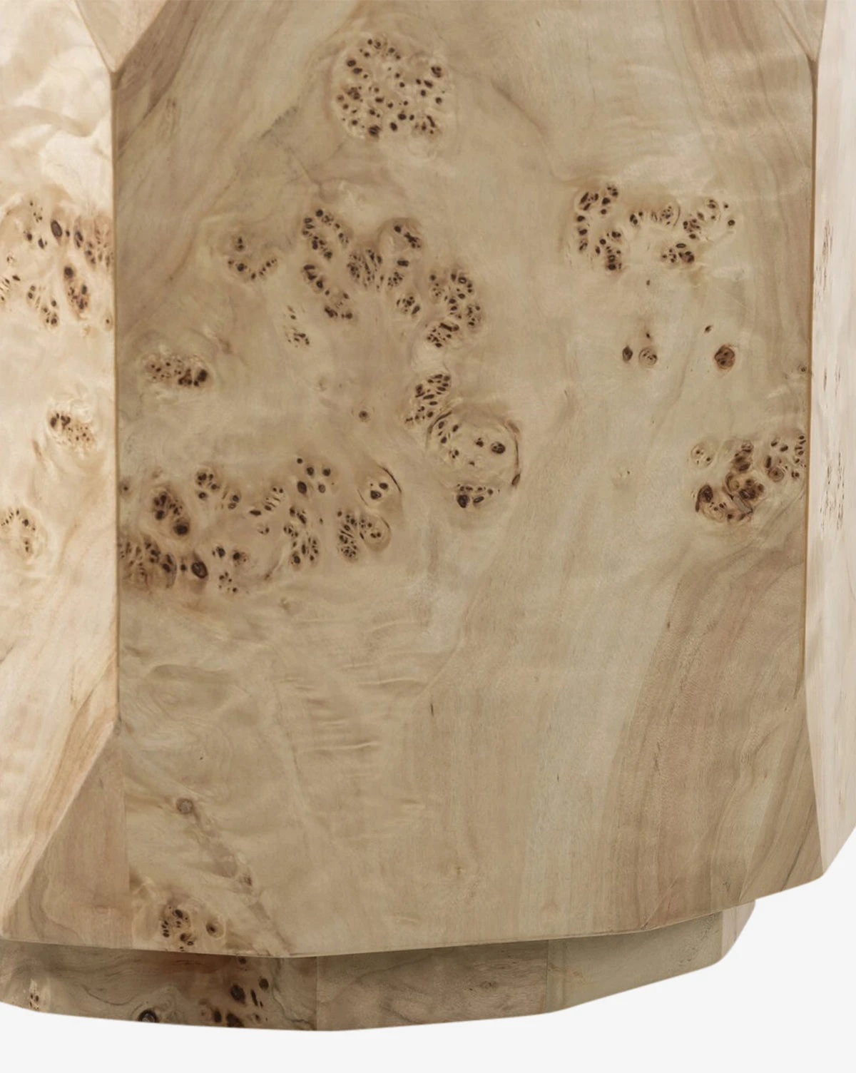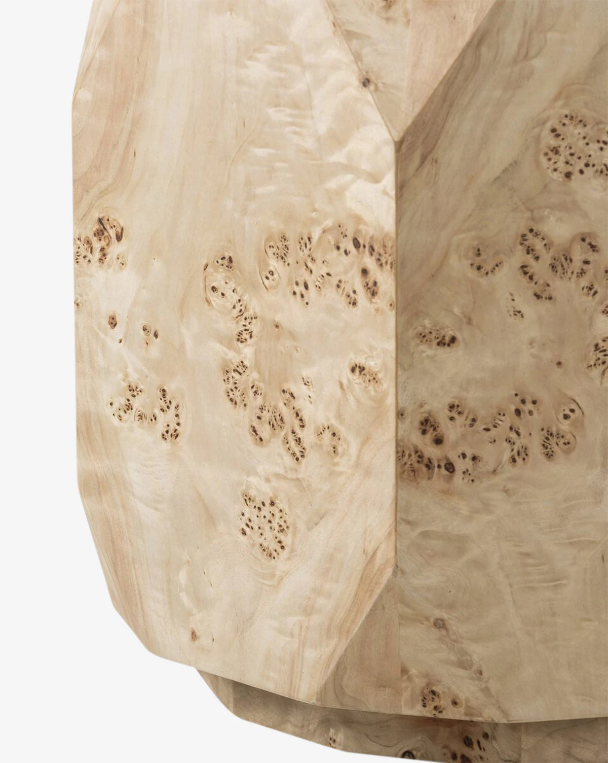 Crafted from light poplar burl, the Remy End Table showcases a striking yet natural form that exudes organic elegance. Its subtle plinth base provides a grounded, balanced look that compliments a variety of interior aesthetics. Â