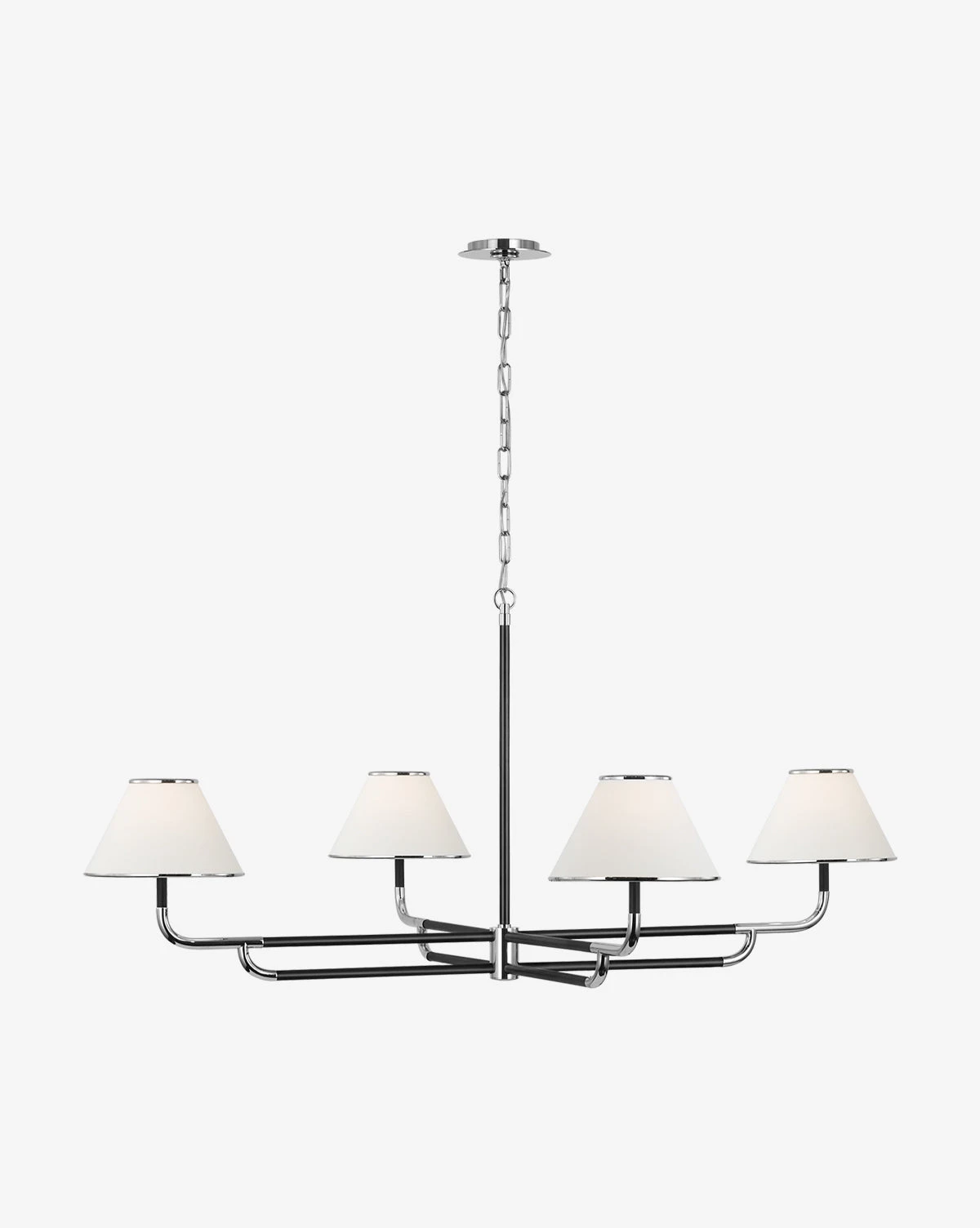 With a modern silhouette, the Rigby Grande Chandelier brings simplicity to your decor with a unique mix of materials. The white linen fabric shades are accented by wood arms that contrast the metal structure in two bold finishes.