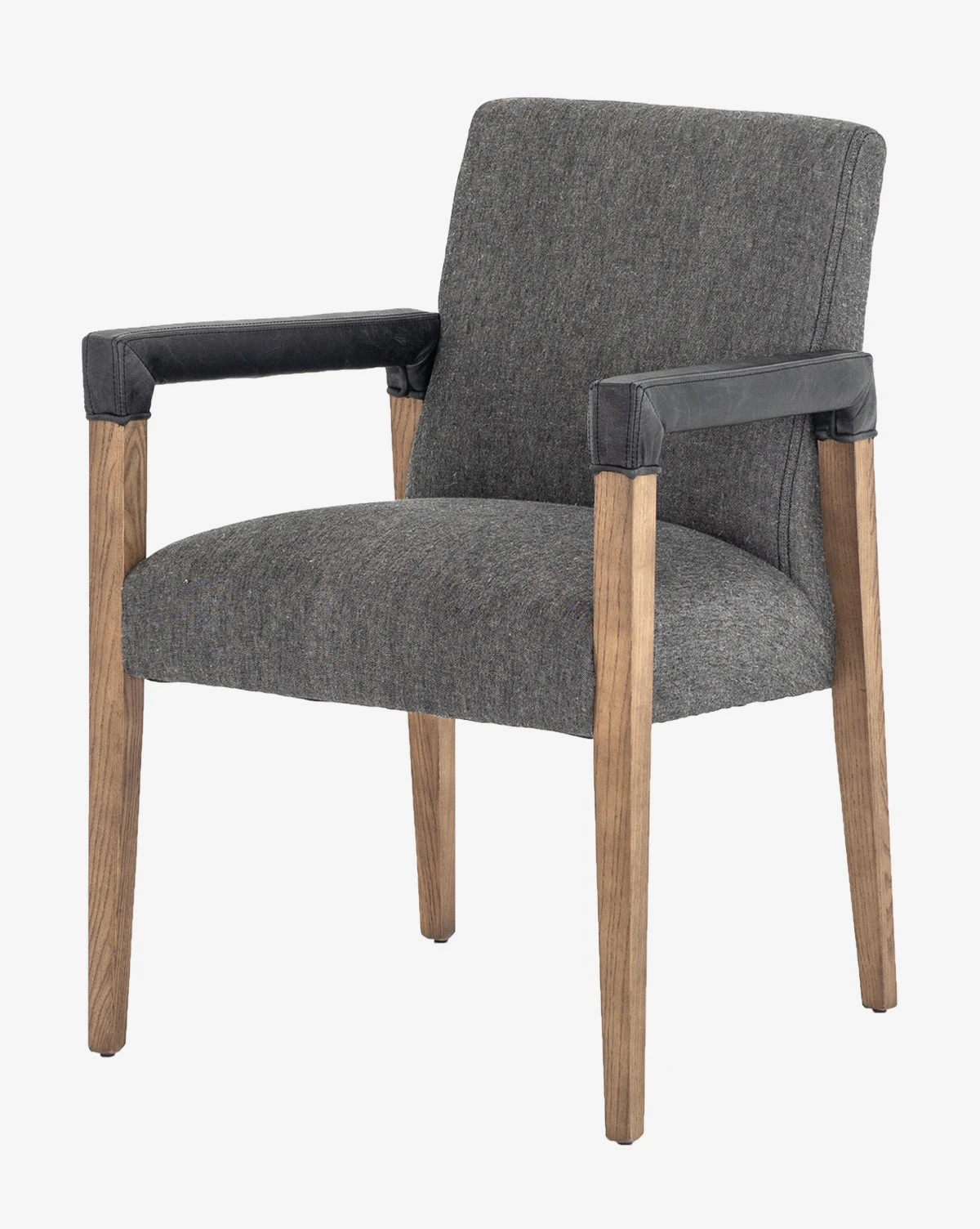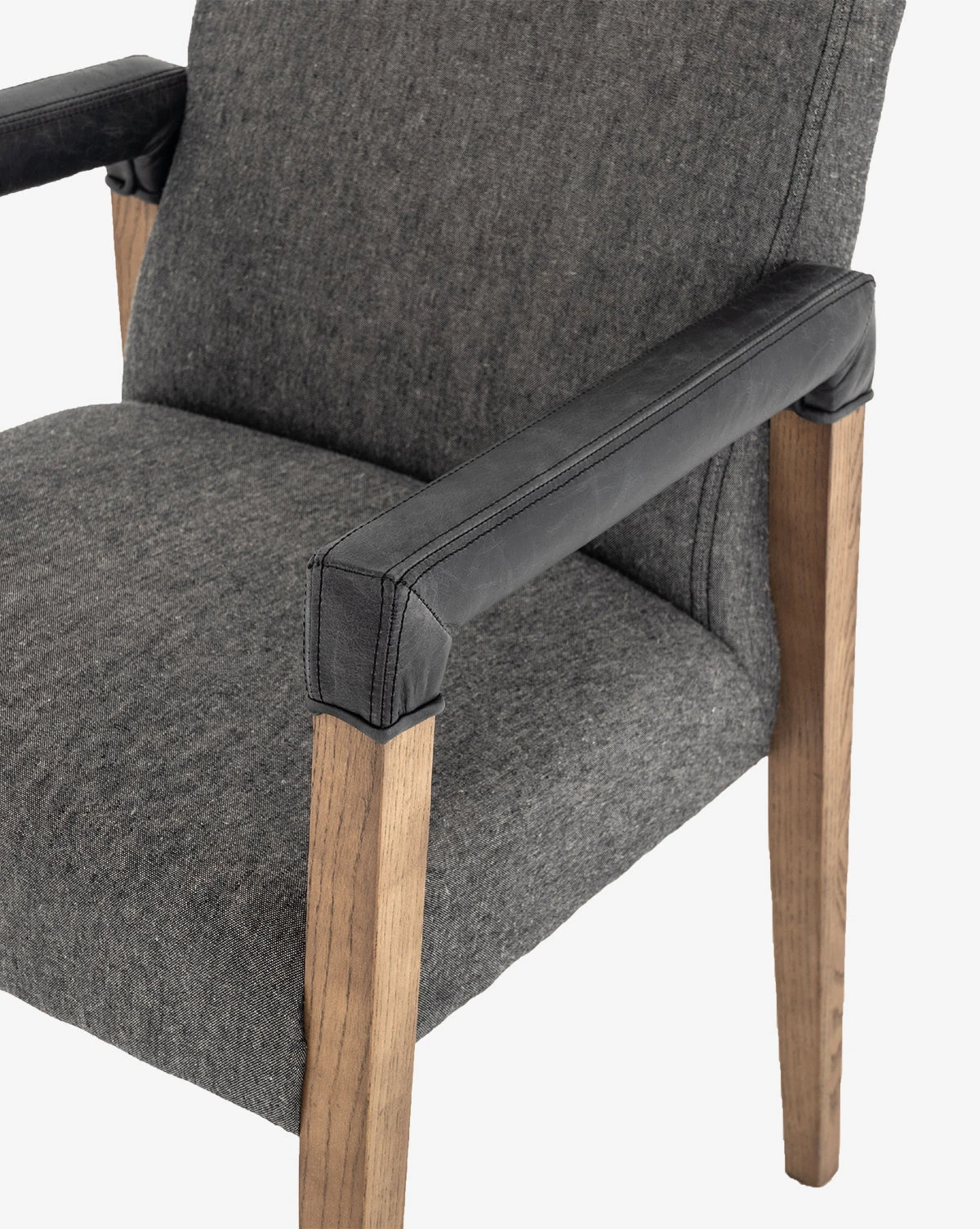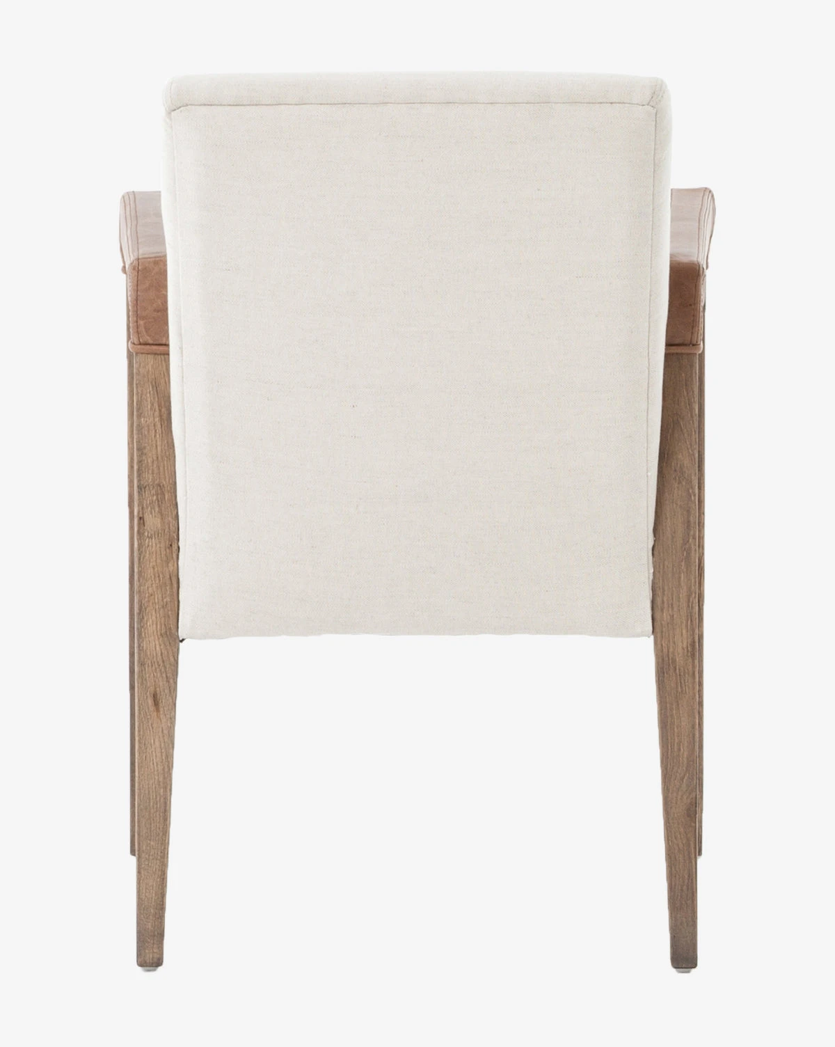 Sophisticated and shapely, our Robby Arm Chair features a masterful mix of materials. Vintage leather adds character covering the slim, tapered arms, as a soft linen blend seat lends the perfect hint of softness. Styled in pairs in your living room, or even around your dining room table, this chair elevates your space with a touch of modern elegance.