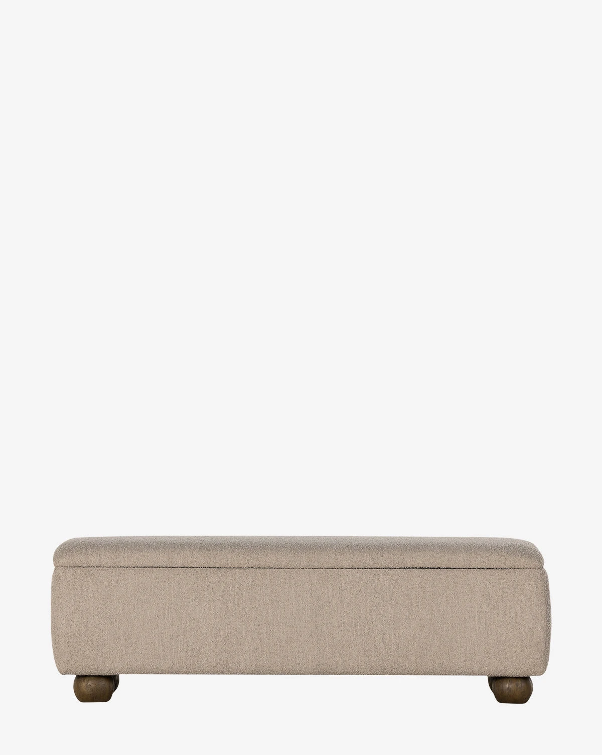 With a modern design, the Rowley Trunk is upholstered in a textural performance fabric. Its rounded edges are complemented by wood bun feet in a dark hazel finish. With storage space inside, the trunk has purpose and function while adding sophisticated style to your space.
