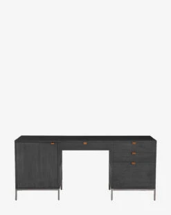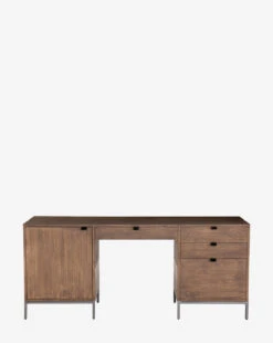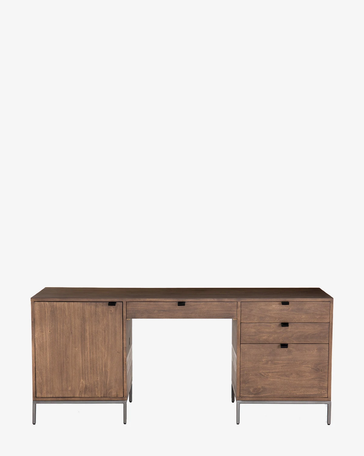 Abounding in storage, the Ryker Desk brings plenty of functionality to your home office. Inspired by clean mid-century design with a modern material mix, this piece lends a textural element of surprise from its leather pulls to the sleek metal base.