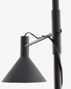 Elegant and modern, the Salem Floor Lamp takes inspiration from a reading light design with a directional light and intentionally exposed black cloth cord. Its sleek base is made from a textured, matte charcoal iron, bringing a subtle industrial feel to the lamp.