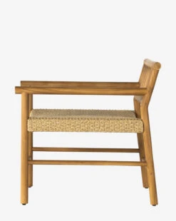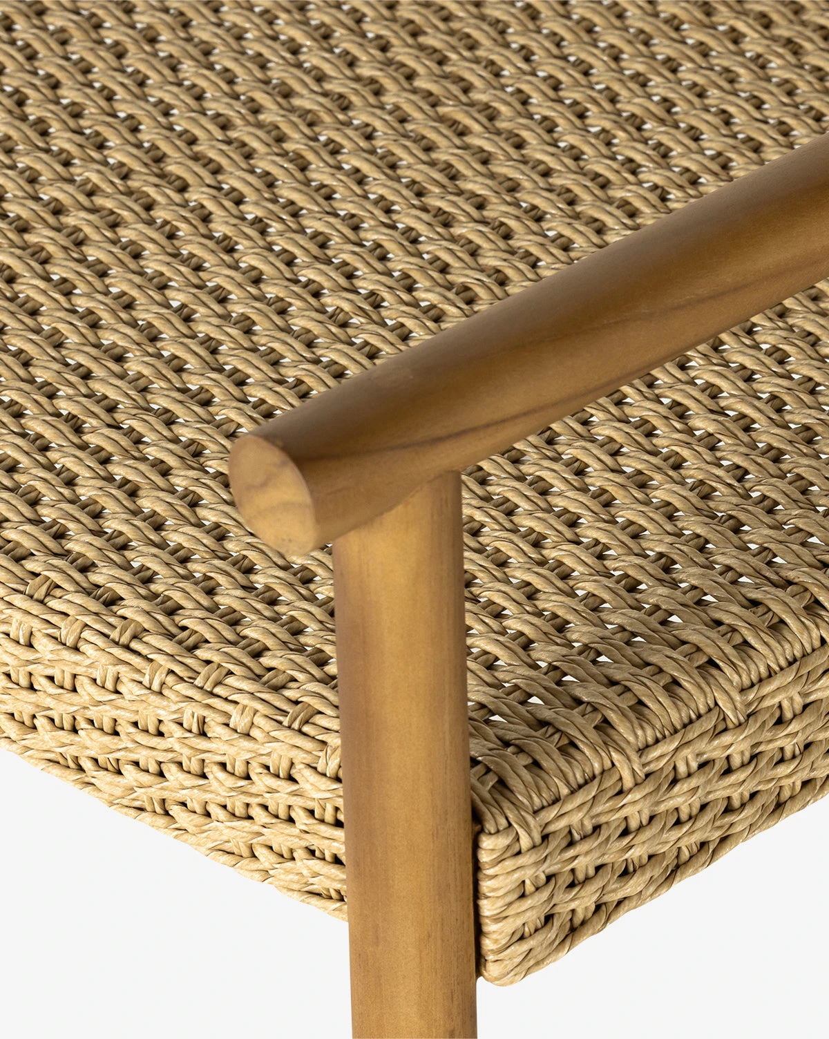 Crafted from all-weather teak and wicker materials, the Salome Outdoor Chair offers both a streamlined aesthetic and weather-resistant outdoor lounging. With a crafted minimalism look, the rounded legs and matching spindles on the back of the chair complement the woven seat.