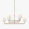 Contemporary in design, the Sawyer Medium Chandelier makes its presence known with its distinctive form. Featuring curved arms with small drum shades made of white linen with a silk diffuser, the metal structure is available in two stunning finishes.
