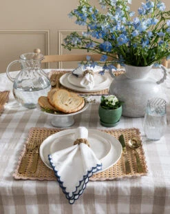 With a subtle blue scallop border, the Scallop Border Napkins add texture and character to your table setting. In a neutral hue, the napkin is made from 100% cotton.